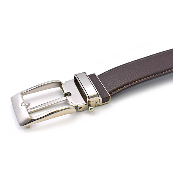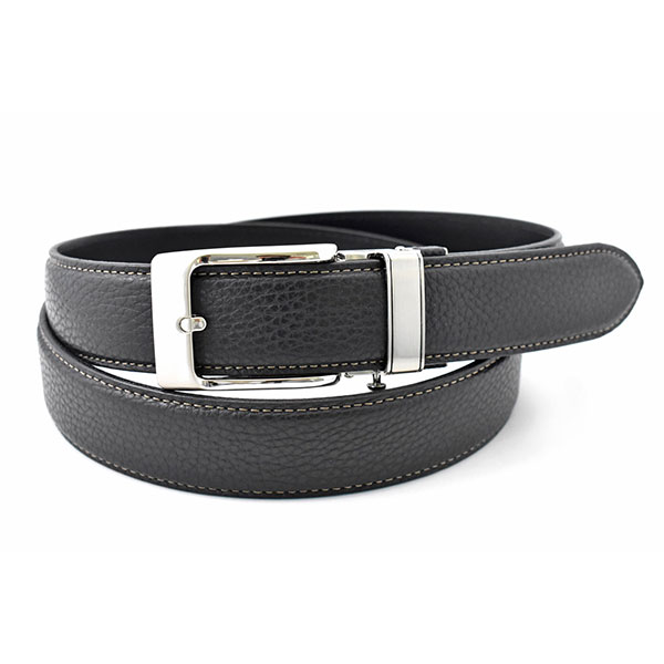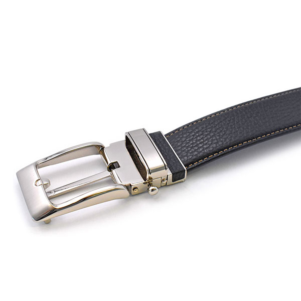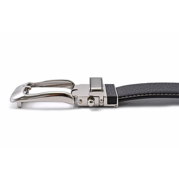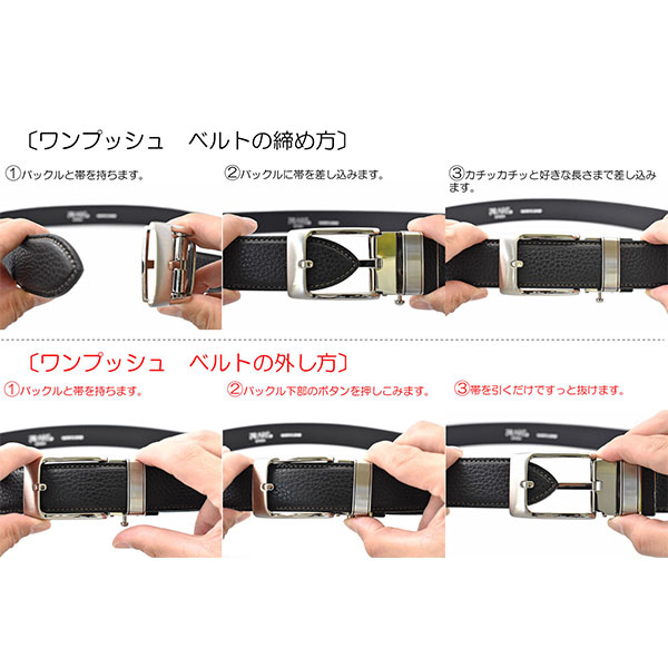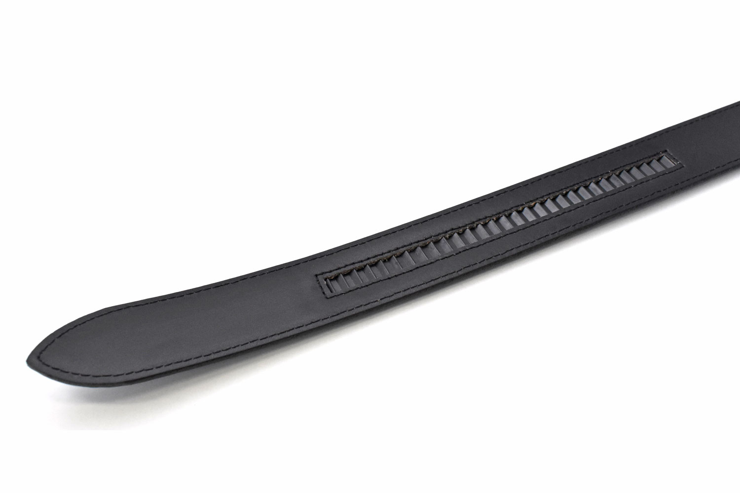 通常のベルトはバックルのピンを帯の穴に差し込む為、着脱時に帯の革に負荷がかかり、痛む傾向にあります。このベルトにはピンも穴もなく、スライドロック式なので革への負担がありません。