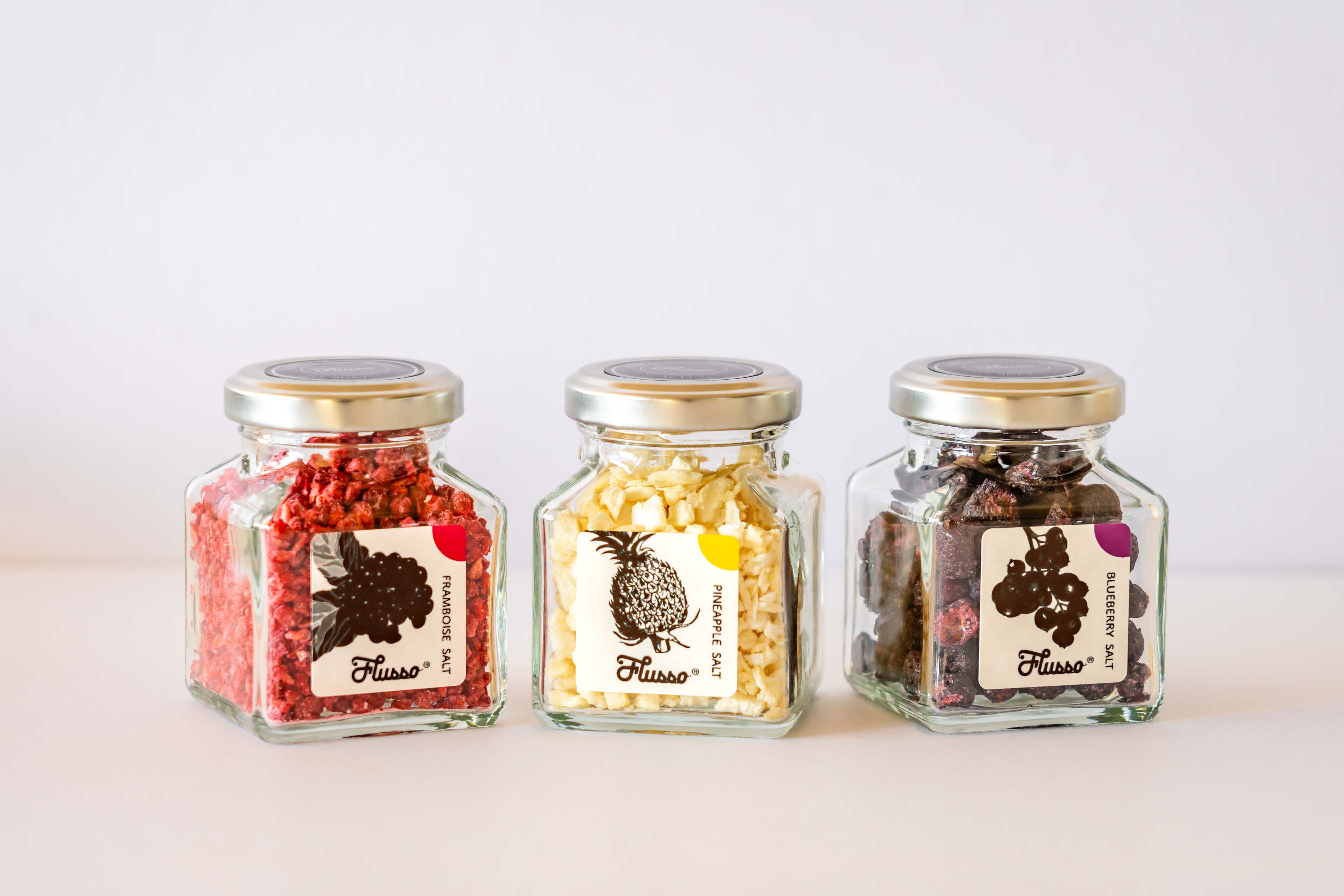 フルッソ プレミアには、果実の豊かな甘みと酸味を生かしたフルーツソルトと、野菜や和の素材の繊細な旨みを引き出した野菜のお塩、それぞれの個性が光る8種類のフレーバーが詰まっています。