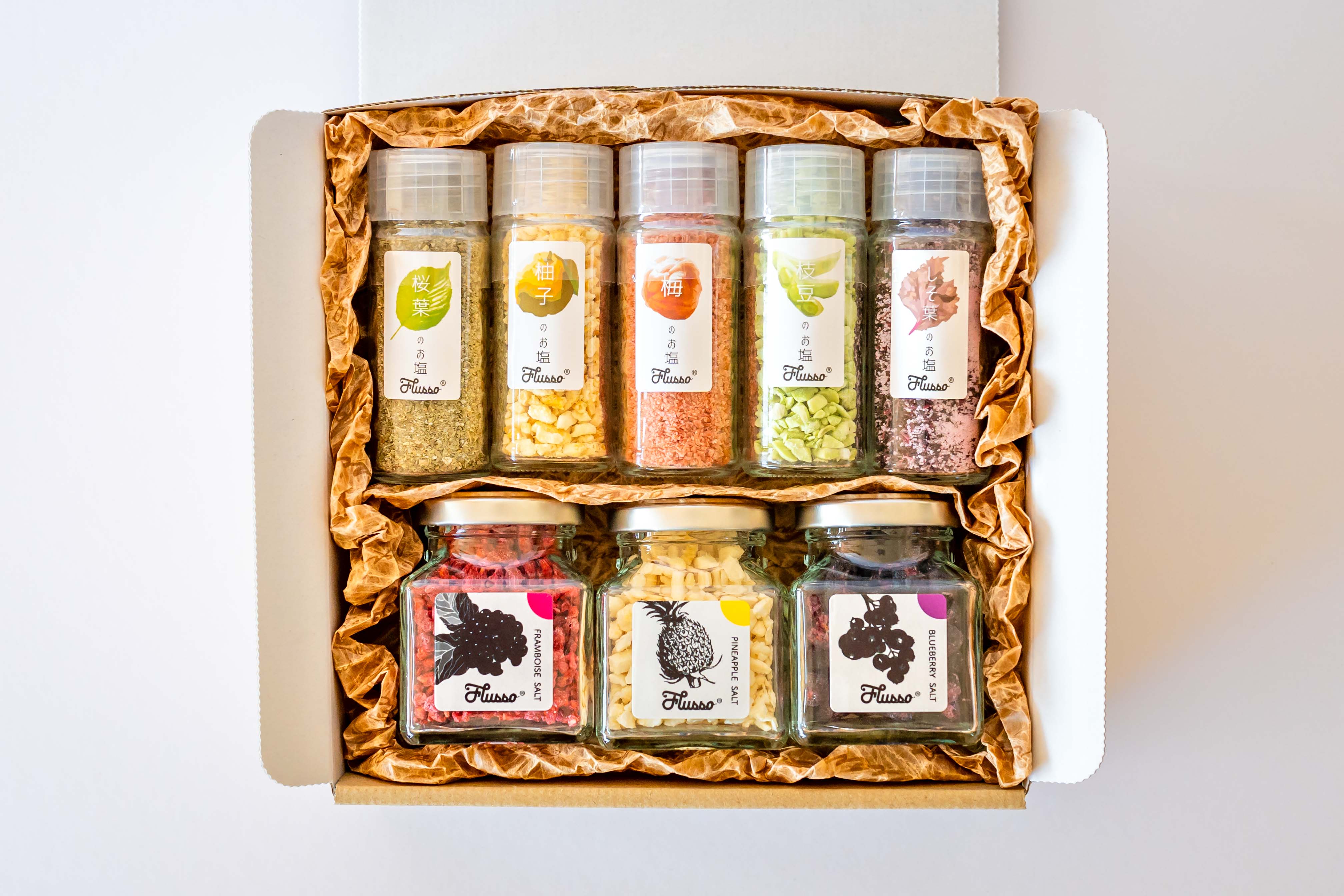 大口注文・法人のお問い合わせはこちら美しい彩り、香り高い風味、そして素材本来のピュアな味わい。 「フルッソ プレミア」は、フルーツソルトと野菜のお塩の全種類をセットにした、特別なギフトコレクションです。 天然の果実や野菜の繊細な味わいを、厳選されたオーガニックソルトと組み合わせて仕上げた逸品。 ひと振りで、料理に華やぎと深みを添え、食卓を特別なひとときへと変えてくれます。 大切な方への贈り物にふさわしい、上質な調味料の詰め合わせ。 洗練されたデザインのオーダーメイドラッピングと送料無料でお届けします。