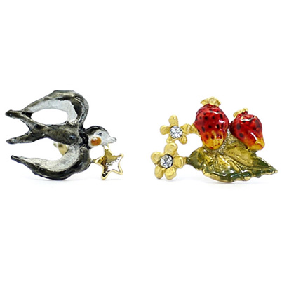 イチゴとつばめのモチーフなので、春から夏にかけてつけたくなるようなデザインです。シンプルなファッションに小物でアクセントを出したい時にぴったりです。髪を耳にかけた時に、シンプルなピアスに紛れてキュートなデザインが見えるととても素敵ですね。ユニークなピアスを探している方にもおすすめのセットです。