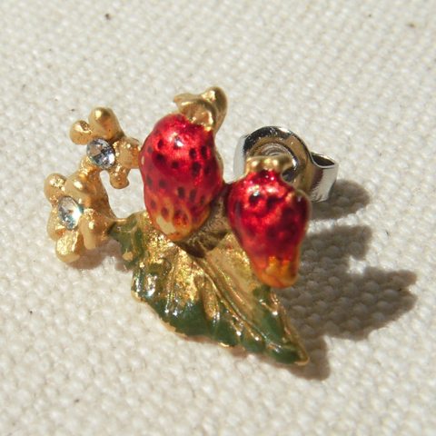 個性的で優しいデザインを追求する「Palnart Poc(パルナートポック)」の、ナイトレ・ストロベリィピアスです。みんなが幸せになるように星を運んでいるつばめと、甘そうなイチゴのデザインです。個性的なデザインはシンプルなファッションのアクセントにピッタリです。
