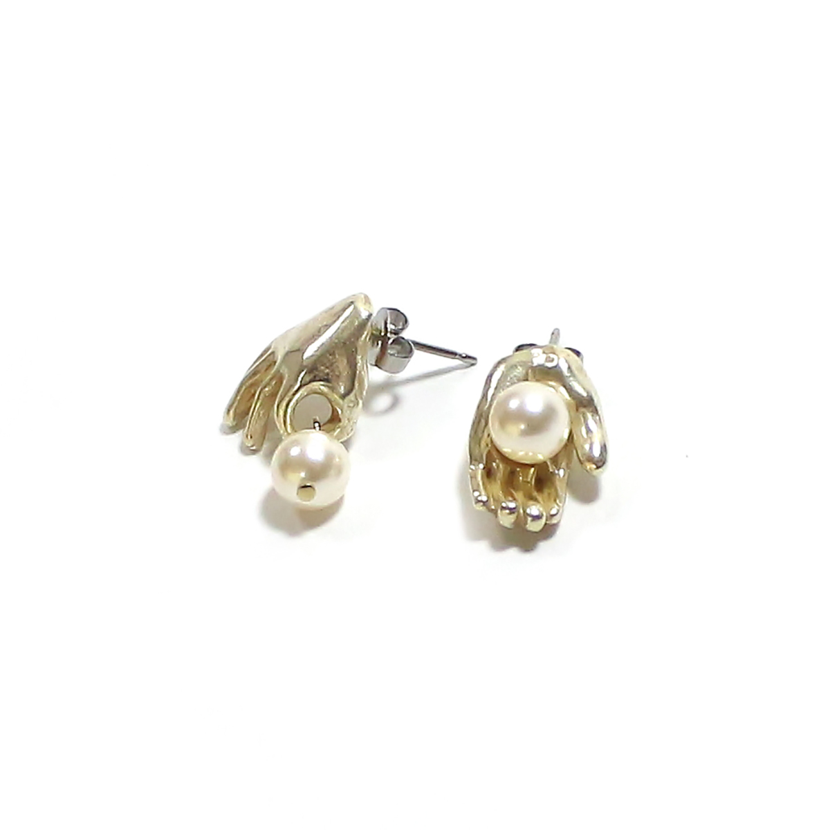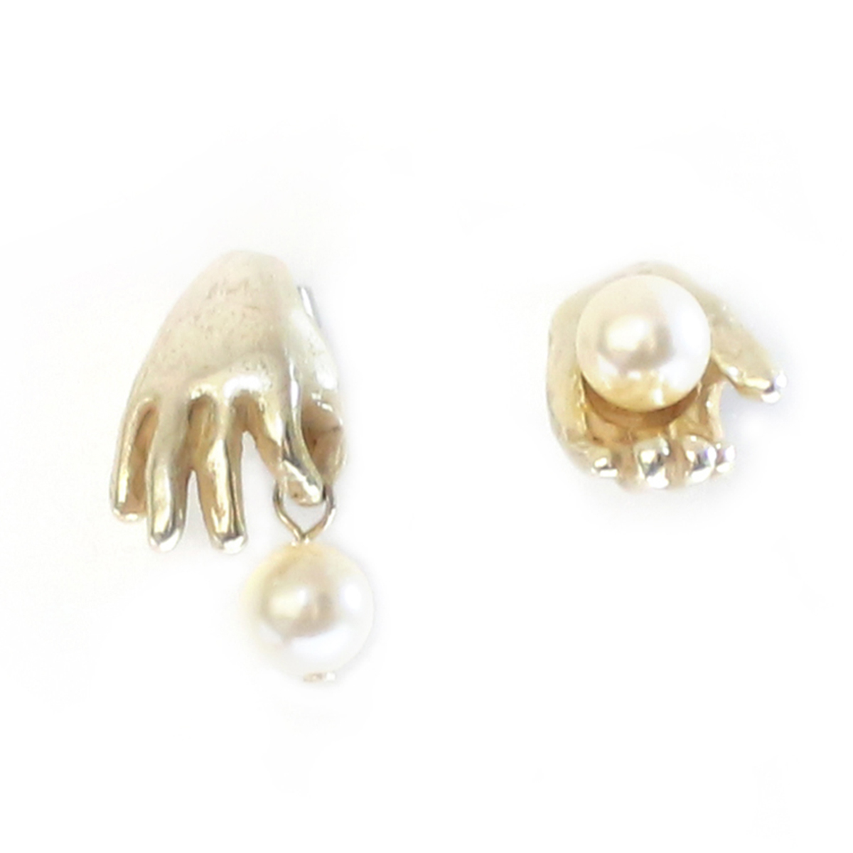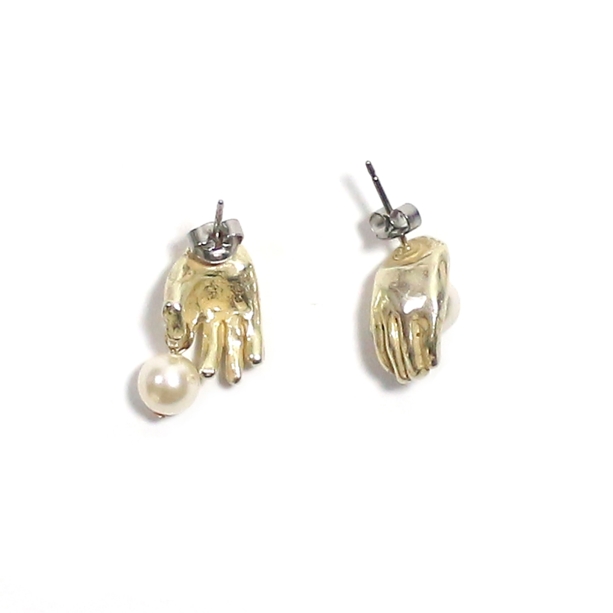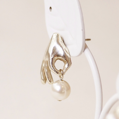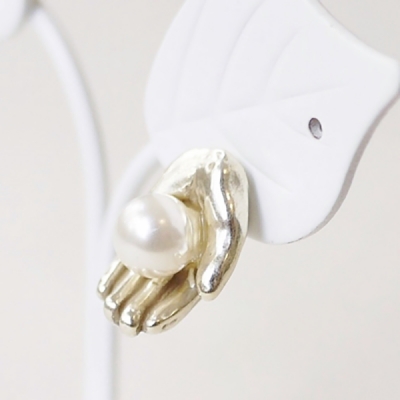 艶のあるシルバーの手は、パールの美しさを引き立てています。シンプルなファッションに印象的なピアスをつけたい時に最適です。他にはないデザインは、ユニークなファッションや小物が好きな方にぴったりですね。歩くたびに優しく揺れるパールがキラキラと輝きます。
