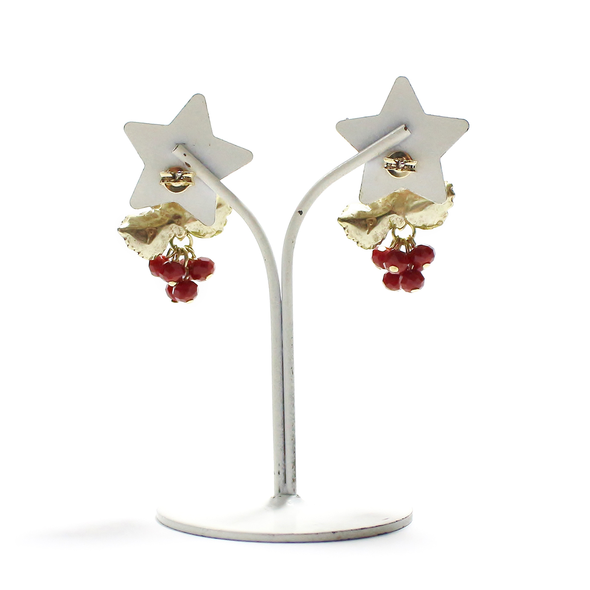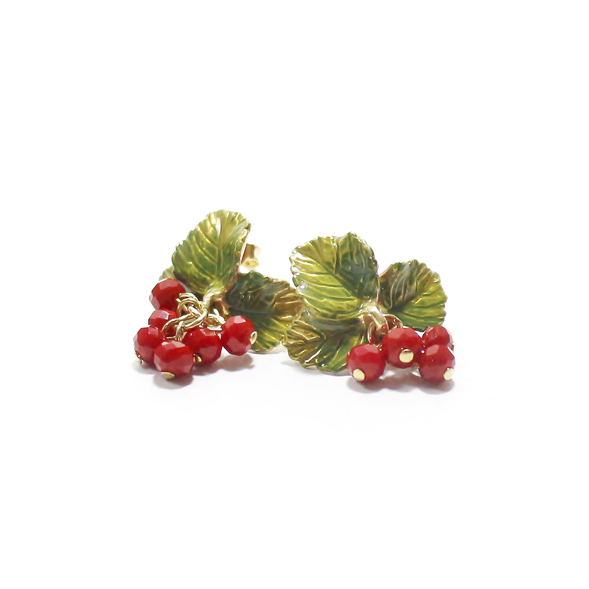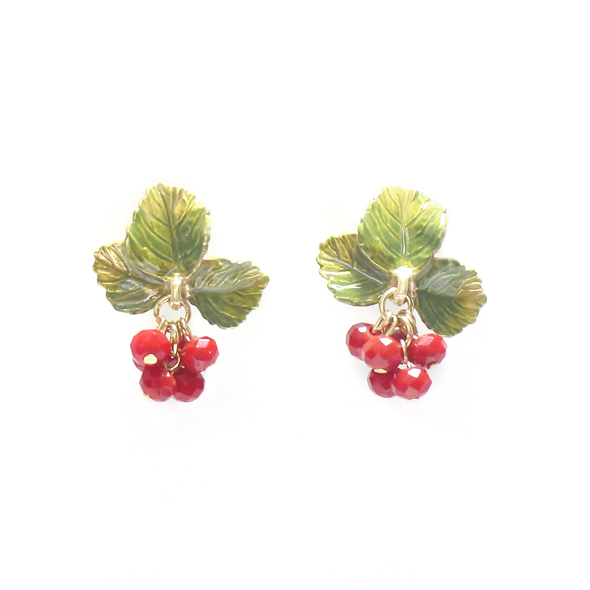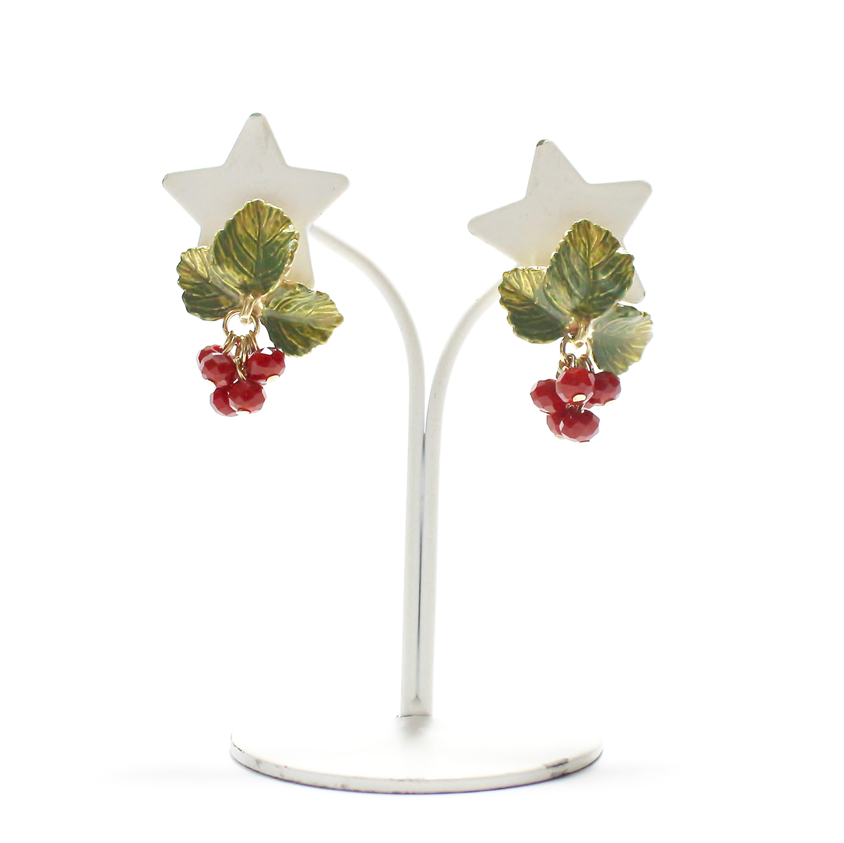 大口注文・法人のお問い合わせはこちら深い緑色の葉っぱと赤色の実が、涼しげな秋の森を思わせます。耳につけると実がそっと揺れるのがチャームポイントです。