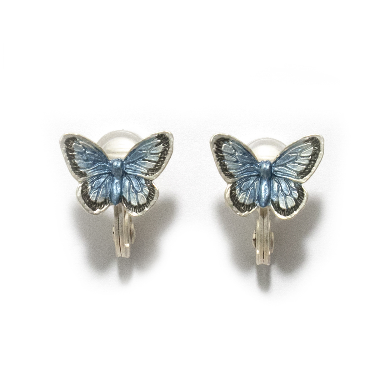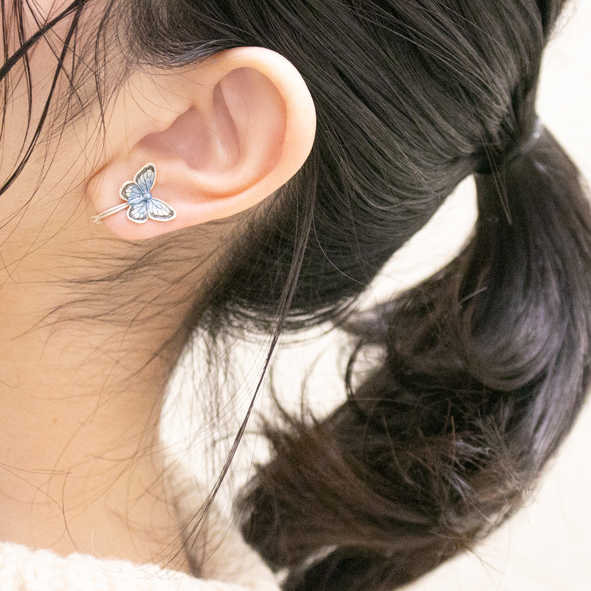 大口注文・法人のお問い合わせはこちらグレイッシュブルーの翅が美しいヤマトシジミチョウのイヤリング。日本に生息する中では小さいサイズの蝶で、イヤリングは実物の蝶をさらに一回り小さくしたようなサイズ感に仕上がっています。光の加減できらめく鱗粉を再現するため、塗料の質感にもこだわって着彩されました。