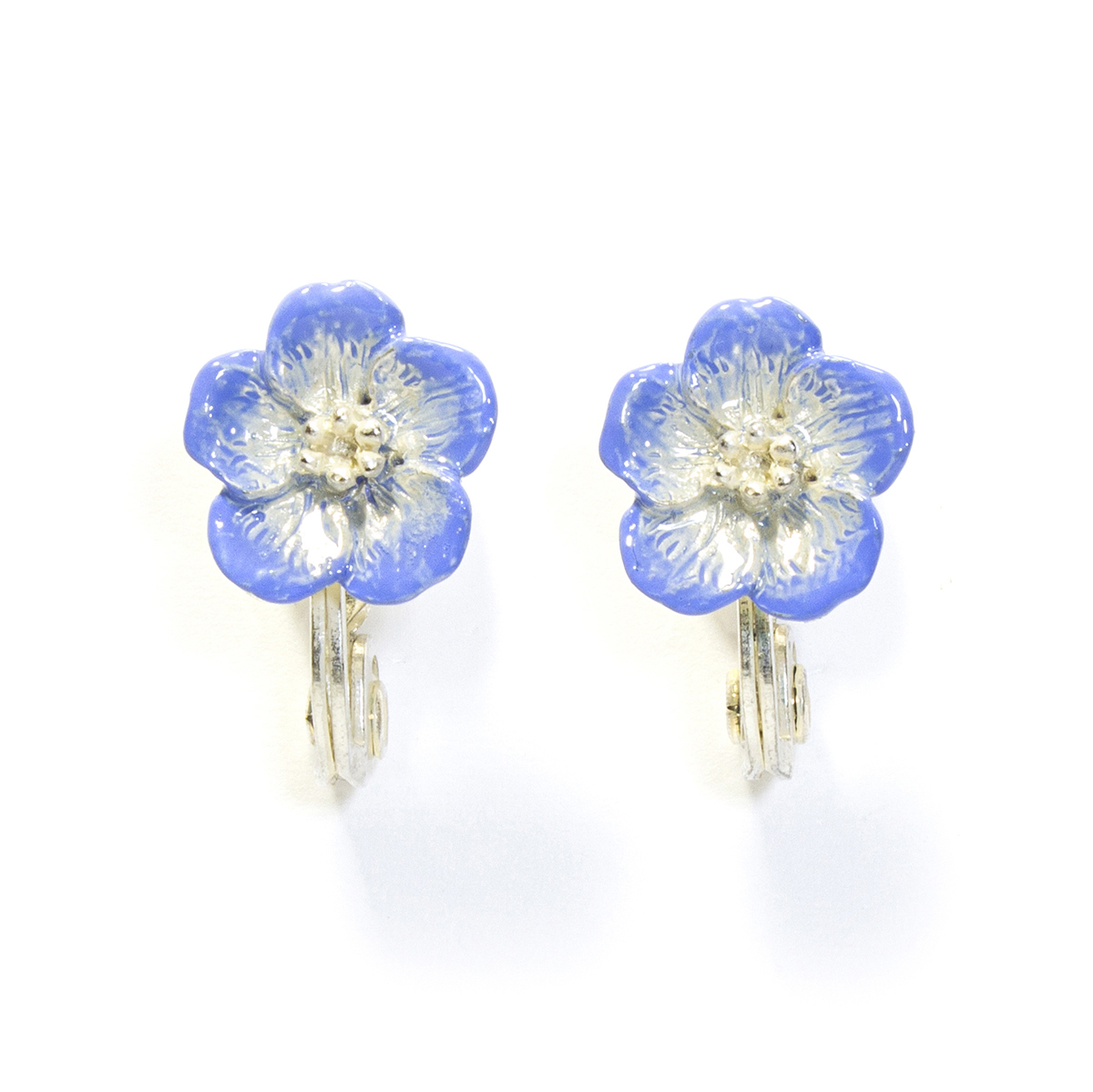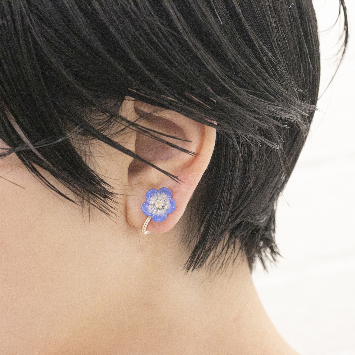 大口注文・法人のお問い合わせはこちら爽やかな瑠璃色が目を引く初夏の花「ネモフィラ」のイヤリング。中央の白色から外側に向かって青くなっている涼しげなカラーリングが特徴です。美しいグラデーションも精巧に再現されています。 ネモフィラの花言葉は「どこでも成功」「可憐」など。