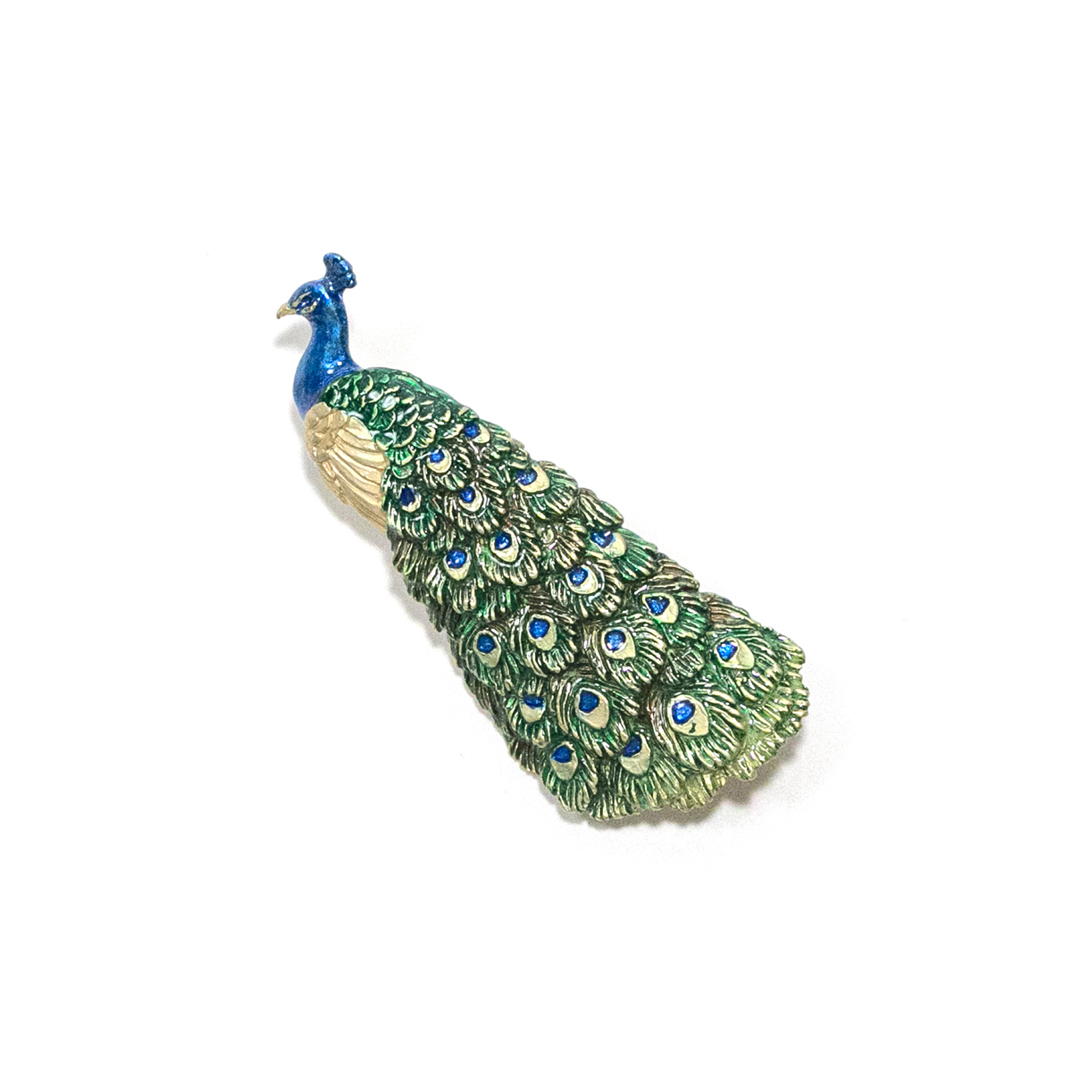 深いブルーとグラデーションが美しいグリーンがベースの孔雀は、優雅で気品を感じます。オスのクジャクの特徴でもあるゴージャスな飾り羽は、ハンドメイドならではの職人の高度な技術がなければ表現できません。普段のファッションのアクセントだけでなく、イベントやパーティースタイルにもおすすめのブローチです。