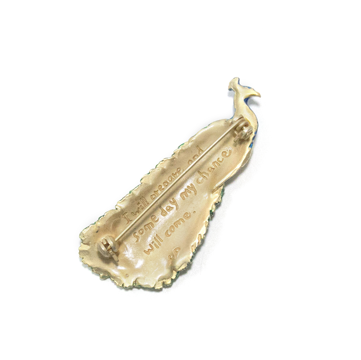 大口注文・法人のお問い合わせはこちら色鮮やかな飾り羽を持つインドクジャクのブローチです。羽根越しに見返る孔雀の凛とした表情と、優雅にたなびく羽根がとても美しいアイテムです。どんな装いにも、華やかに彩りを添えてくれます。 ブローチの裏側に書かれた「I will prepare and some day my chance will come.(準備しておこう。チャンスはいつか訪れるものだ。)」はリンカーンが遺した名言です。