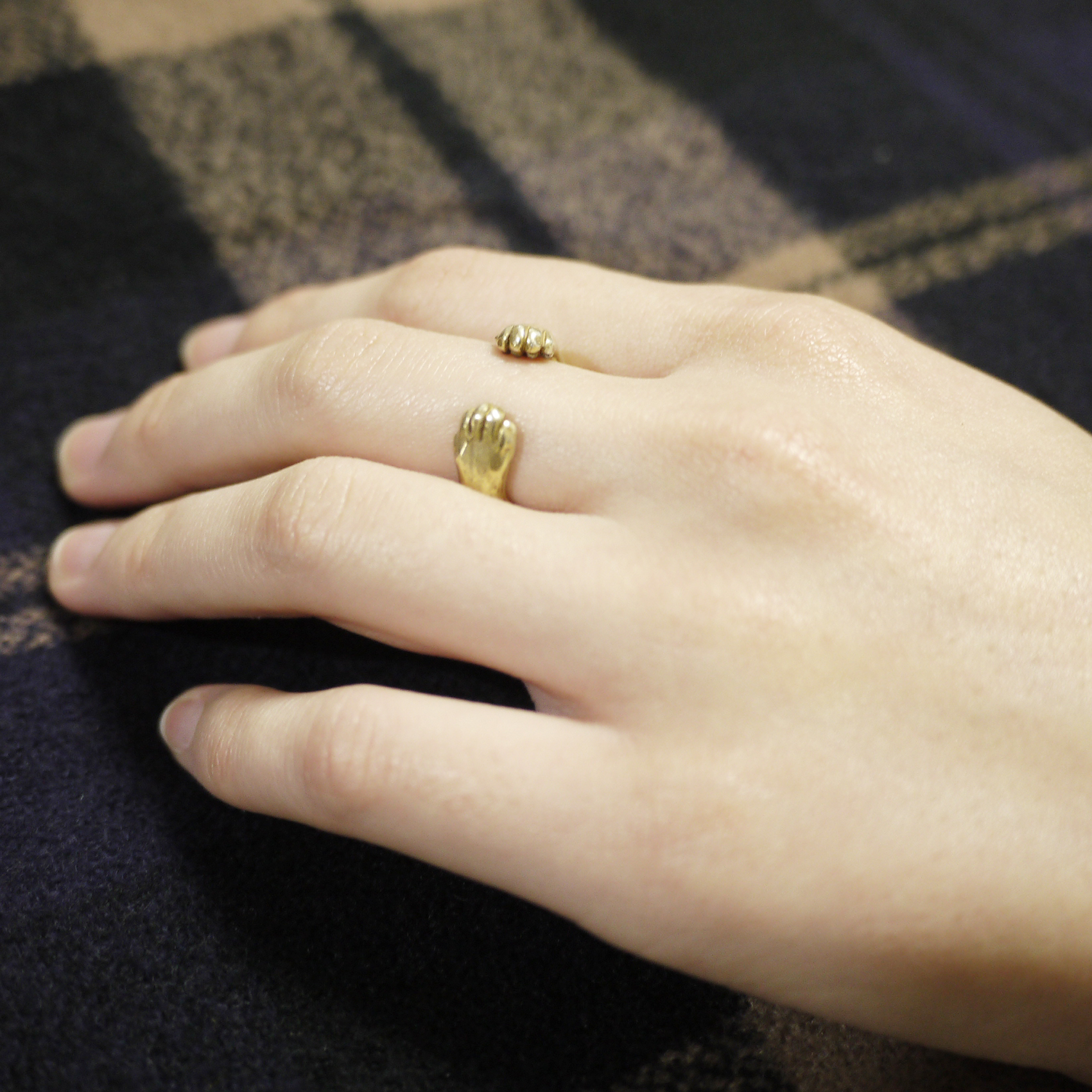 大口注文・法人のお問い合わせはこちらライオンの子供にギュッとハグされているかのような、とってもキュートなリング。 リングの内側には可愛らしい肉球が。 なんとリングを外すと指にほんのり肉球の跡が残るというサプライズつき! 一度抱きしめられると母親代わりになってあげたくなりますね。 肉球大好きネコ好きさんをはじめ、動物好きな方におすすめなアイテムです。