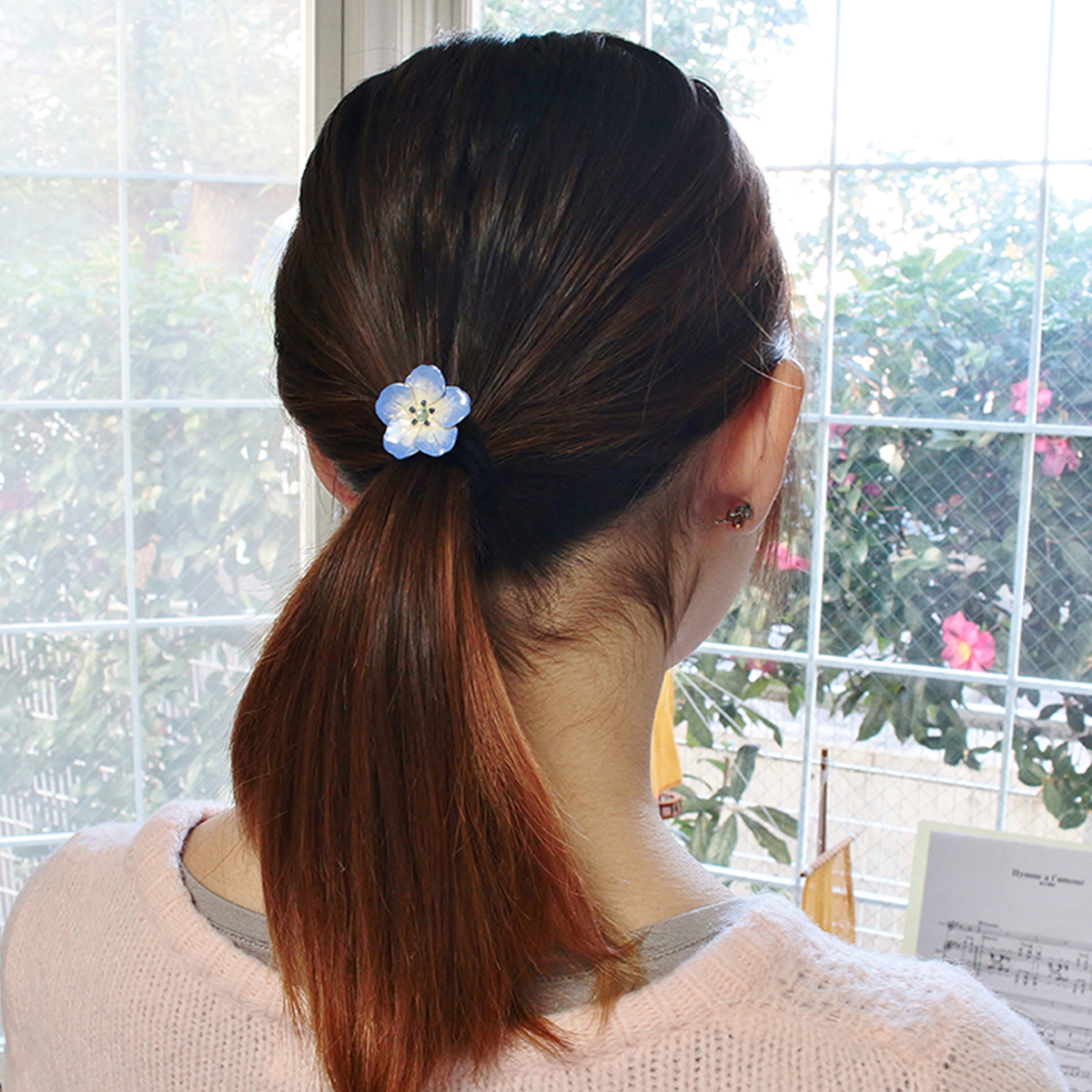 大口注文・法人のお問い合わせはこちら爽やかな青のグラデーションが美しいネモフィラのヘアフック。おしべの色合いや花びらの筋など細部にもこだわり、見ていて飽きないデザインです。髪にひとつ添えるだけで、爽やかで可憐な印象を与えてくれます。 花言葉は「どこでも成功」「可憐」。