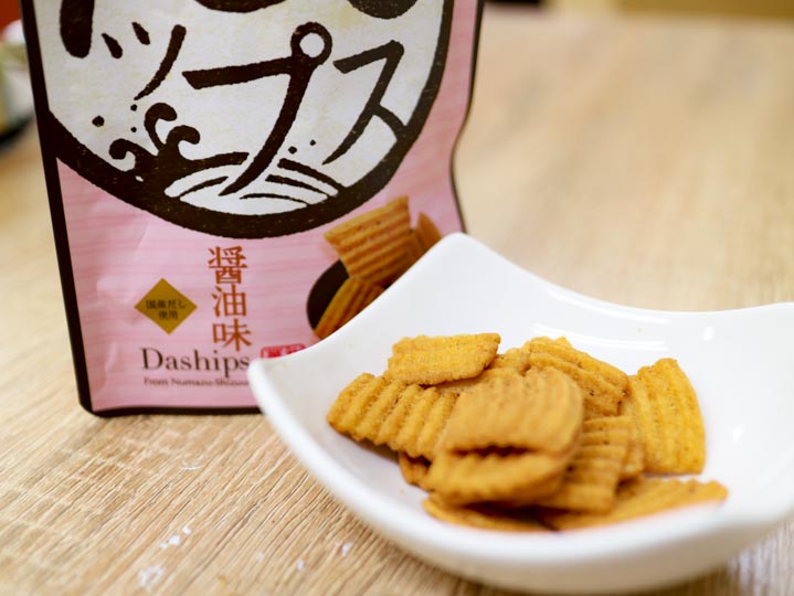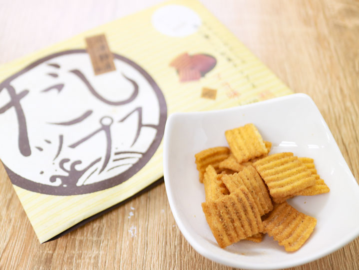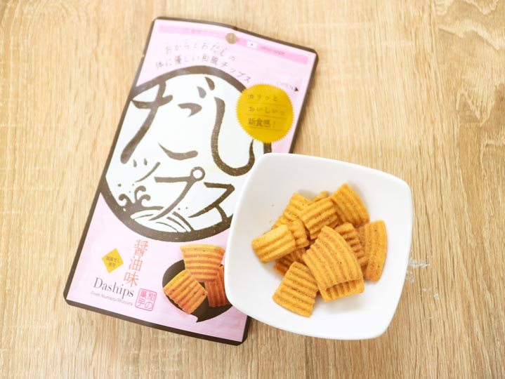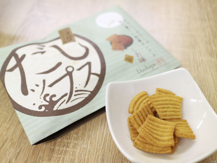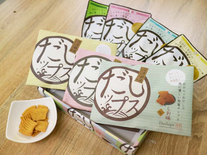 おからとおだしで作られた、体に優しい和風チップス「だしップス」。幅広い世代の方に食べていただけるように、「しお・マヨ・醤油・わさび」4 種の風味をご用意しました。主原料のおからと小麦粉、粗糖は国産のものを使用していますので、安心してお召し上がりいただけます。