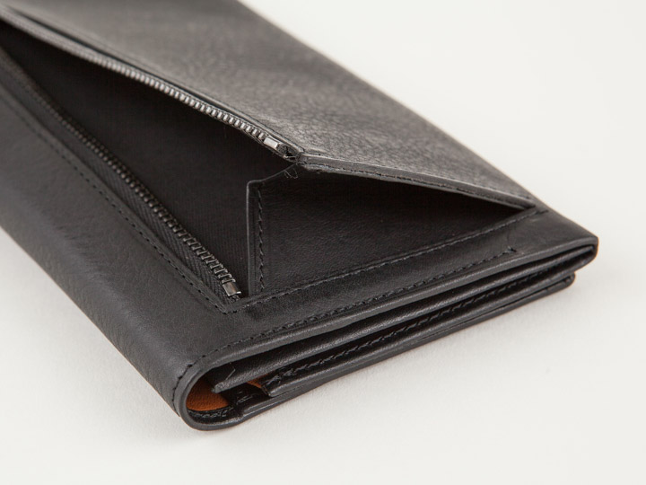小銭入れは財布の中ではなく背面に付属しています。 小銭の出し入れも楽々です。 ファスナーのスライダーはフラットなタイプなので、 かばんやポケットに入れても引っ掛かりません。 アンティーク調のブラックのファスナーで大人な印象に