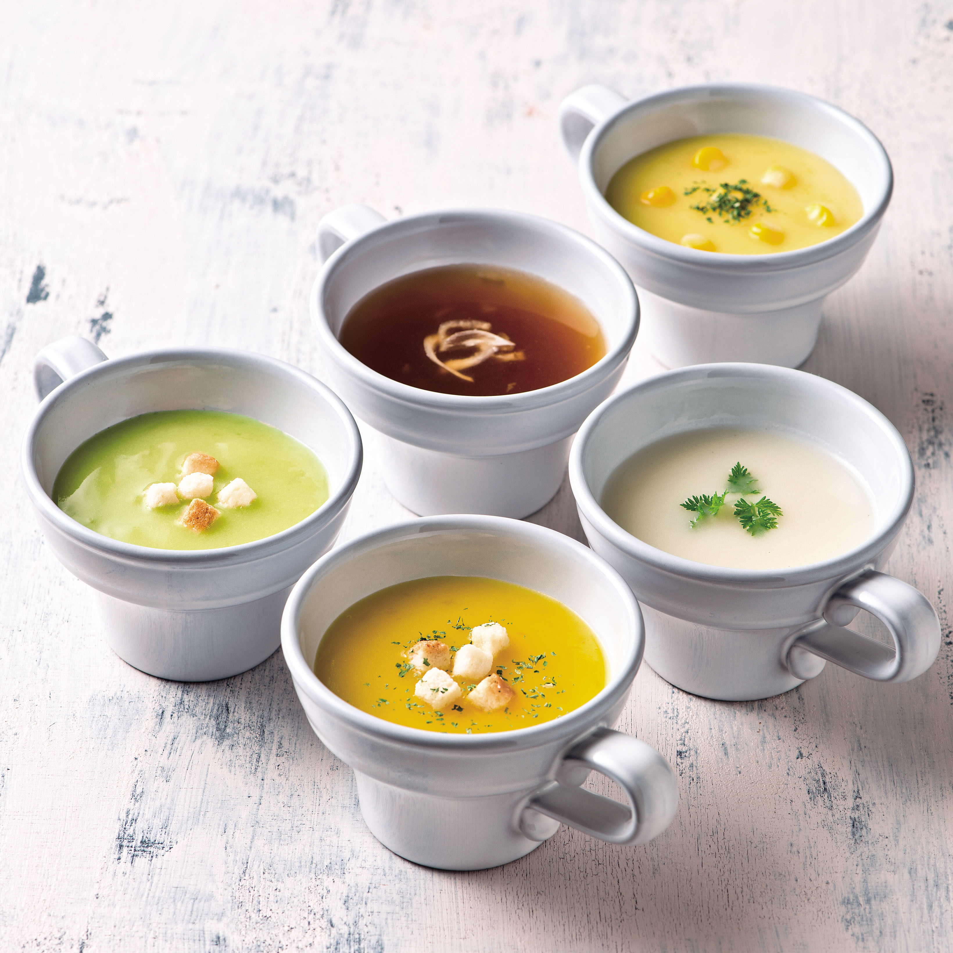 かぼちゃ、玉葱、男爵イモ、スウィートコーン、アスパラガスの5種類のお味がお楽しみいただけます。