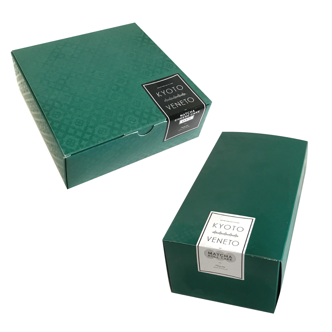 | パッケージ外装 | 宇治抹茶生チーズケーキジェミニ:直方体化粧箱 宇治抹茶生チーズロール:直方体化粧箱 |