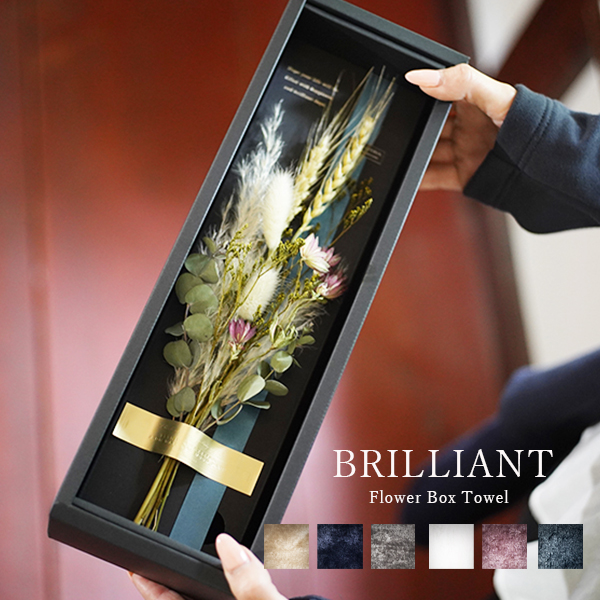 大口注文・法人のお問い合わせはこちら花言葉に「想い」込めて贈る特別なギフト「BRILLIANT花束箱バスタオル 【Harvest】」。 感謝を伝えたいけど、何を贈ればいいかわからない。 そんなお客様の想いをかなえるために創りました。 実用的なバスタオルはもちろん、ドライフラワーの花束は、パッケージのまま飾ることができ、経年変化も楽しめます。 手書きのメッセージカードを入れて贈ると、花言葉と相まってより贈る側の想いが伝わります。