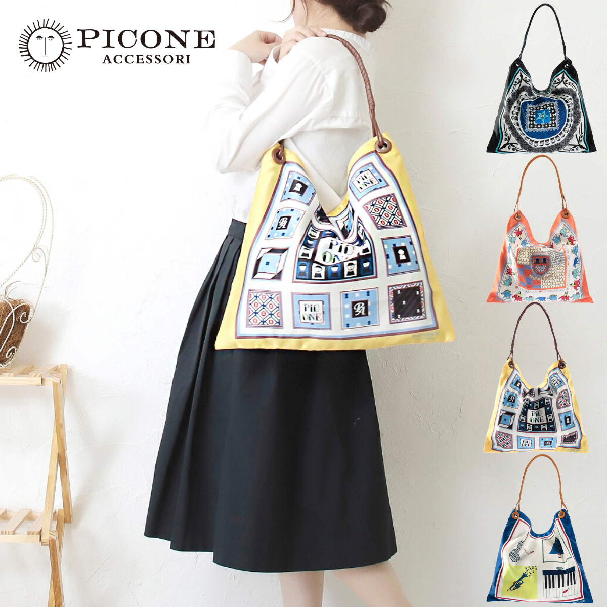人気のスカーフ柄バッグの新作シリーズです。 長めの持ち手で肩から掛けて使えます。 柄のひとつひとつに、司祭がいる「PICONE」らしい遊び心のあるグラフィックと、ファッションのアクセントになるカラーが特徴的。裏地付きで内ポケットもついているので、機能的に使えます。