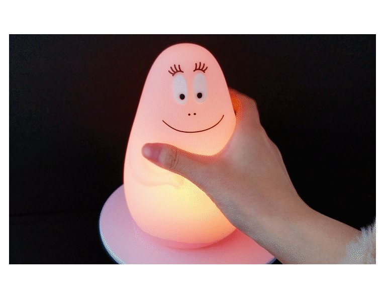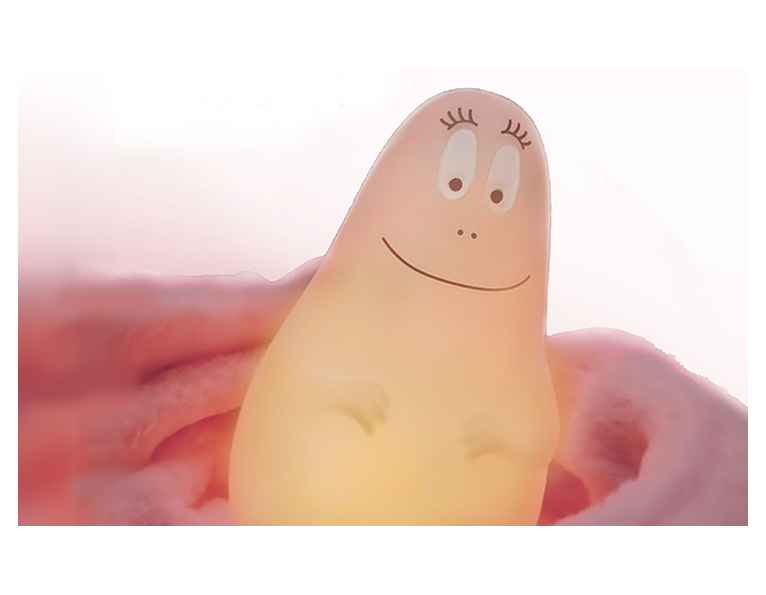 ぬいぐるみのようにぎゅっと抱きしめたくなるやわらかい触り心地、シリコン製のバーバパパのおやすみライト。バーバパパは、アネト・チゾンさんとタラス・テイラーさんが街角のカフェで、紙製のテーブルクロスにいたずら書きを交換していた際に誕生しました。