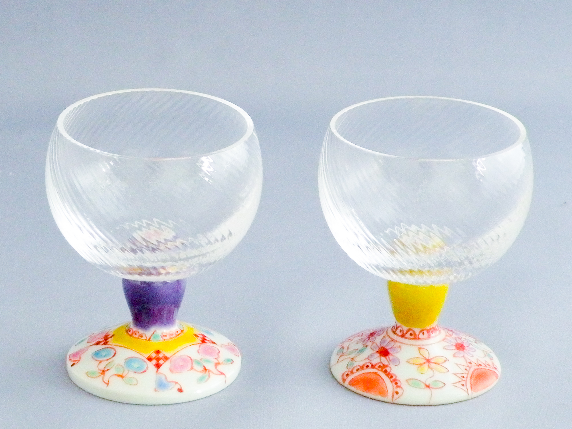昭和39年創業「清峰堂」の代表的な商品「九谷和グラス」シリーズ。九谷焼磁器と手作りの吹き硝子(江戸硝子)を独自の技術により融合させた馬上グラスのペアセットです。冷酒用のグラスや、珍味入れとしても人気。明るい色彩、可愛らしい上絵付で人気の銀舟さんのデザインです。