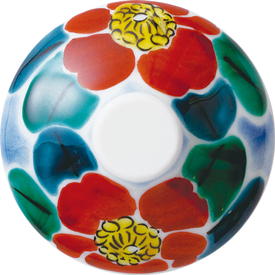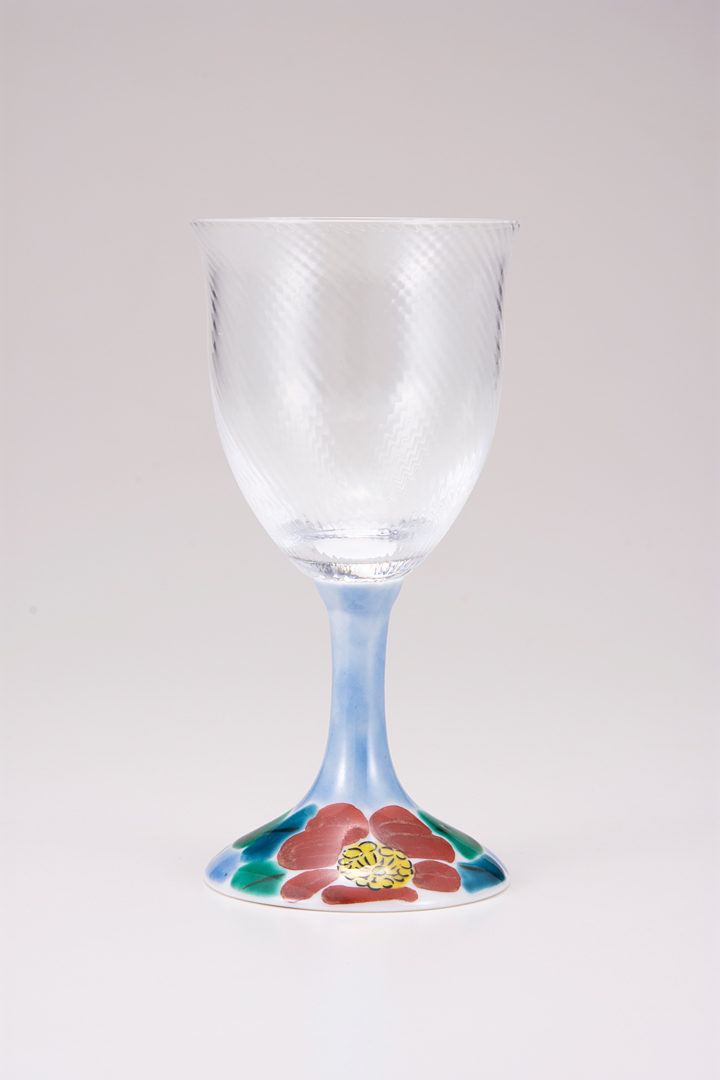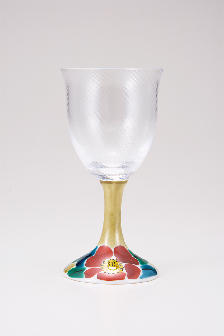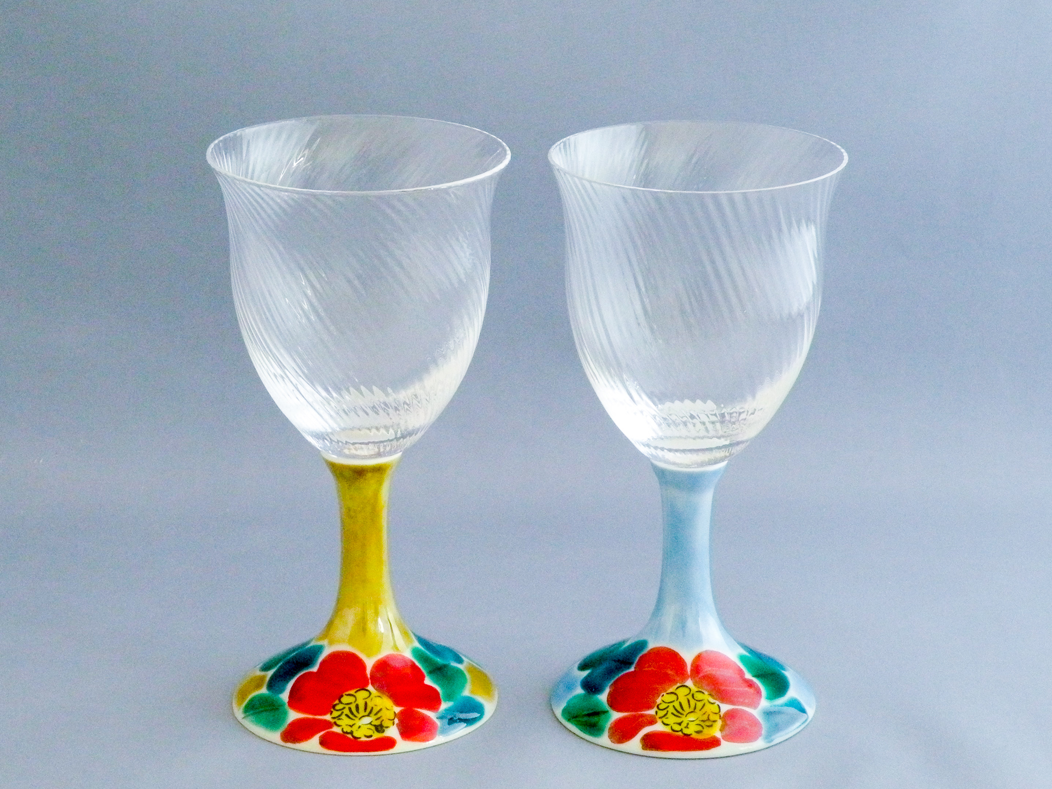昭和39年創業「清峰堂」の代表的な商品「九谷和グラス」シリーズ。九谷焼磁器と手作りの吹き硝子(江戸硝子)を独自の技術により融合させた、ワイングラスをペアでお届け。ご愛用品としても、ご贈答用としても大変人気が御座います。脚部分は、可憐な山茶花を描きました。