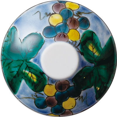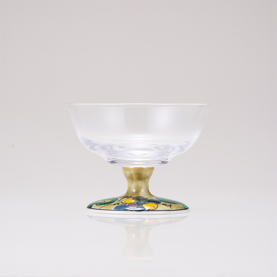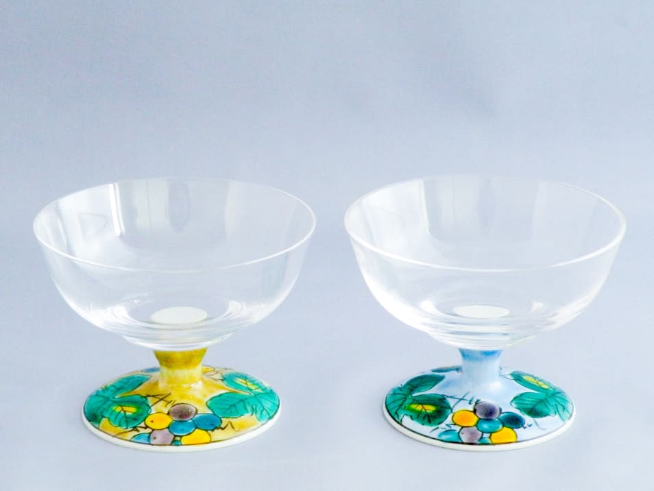 昭和39年創業「清峰堂」の代表的な商品「九谷和グラス」シリーズ。九谷焼磁器と手作りの吹き硝子(江戸硝子)を独自の技術により融合させた、デザートグラスをペアでお届け。ぶどうの豊かに実る房やツルは、子孫の繁栄や永遠に続くとされ、縁起の良い柄と言われています。