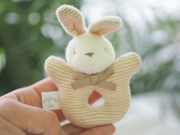 握ると音が鳴ることで赤ちゃんも喜ぶアイテム。外側はオーガニックコットンを使ってますので触れたり噛んだりしても安心です。