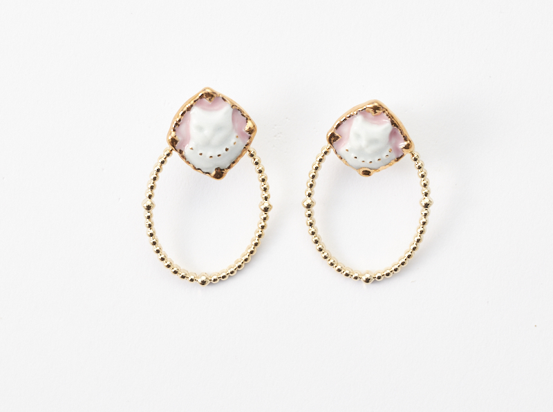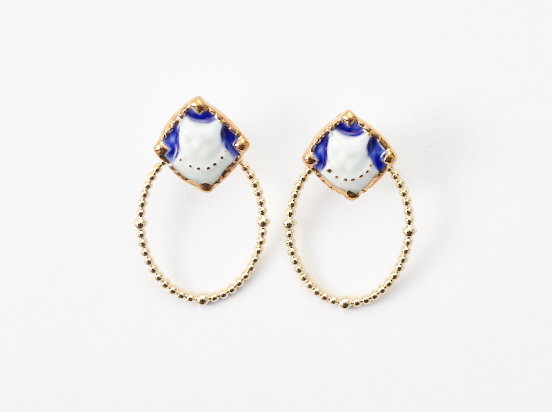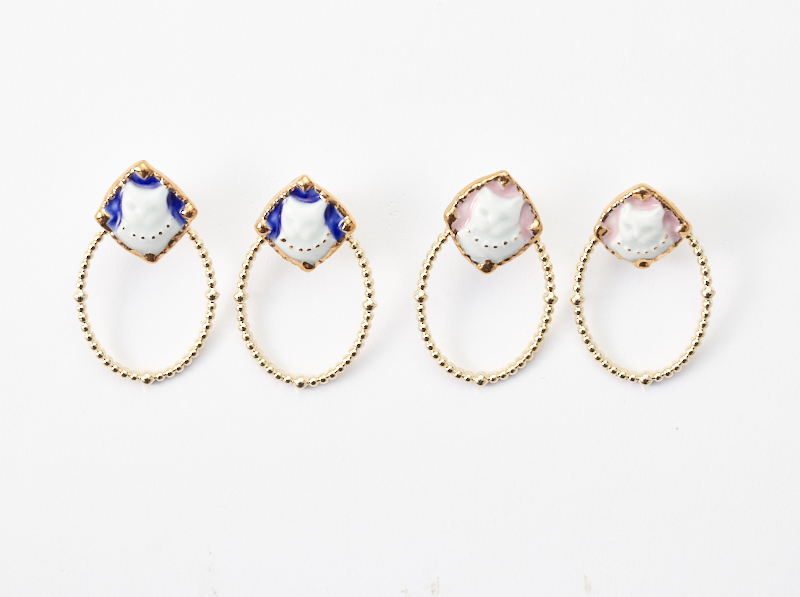 佐賀県の有田町で作られる有田焼の陶器とオリジナルメタルを組み合わせたアクセサリー。陶器は職人さんがひとつひとつ丁寧に作り上げているものなので、ポップなデザインの中にぬくもりを感じるシリーズです。