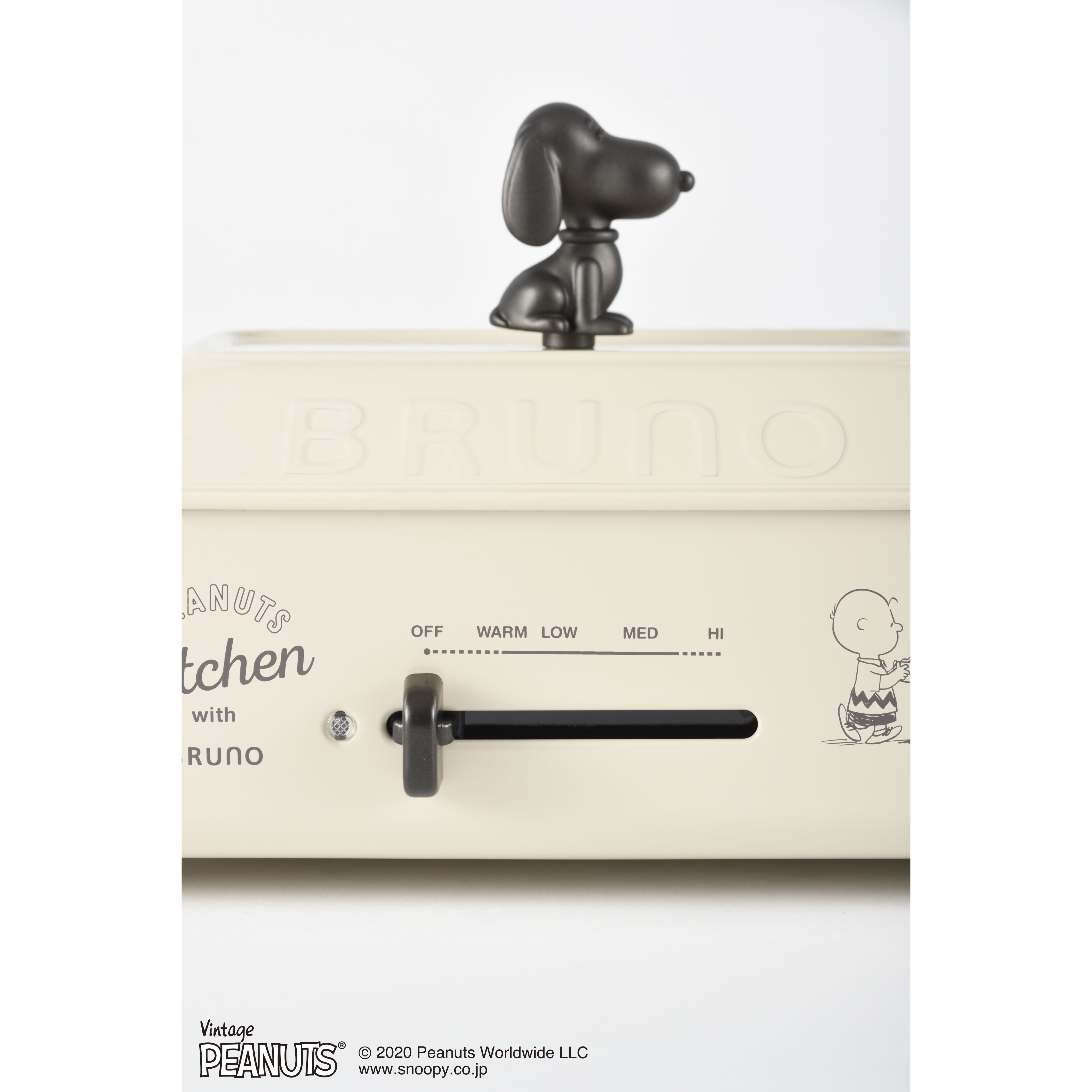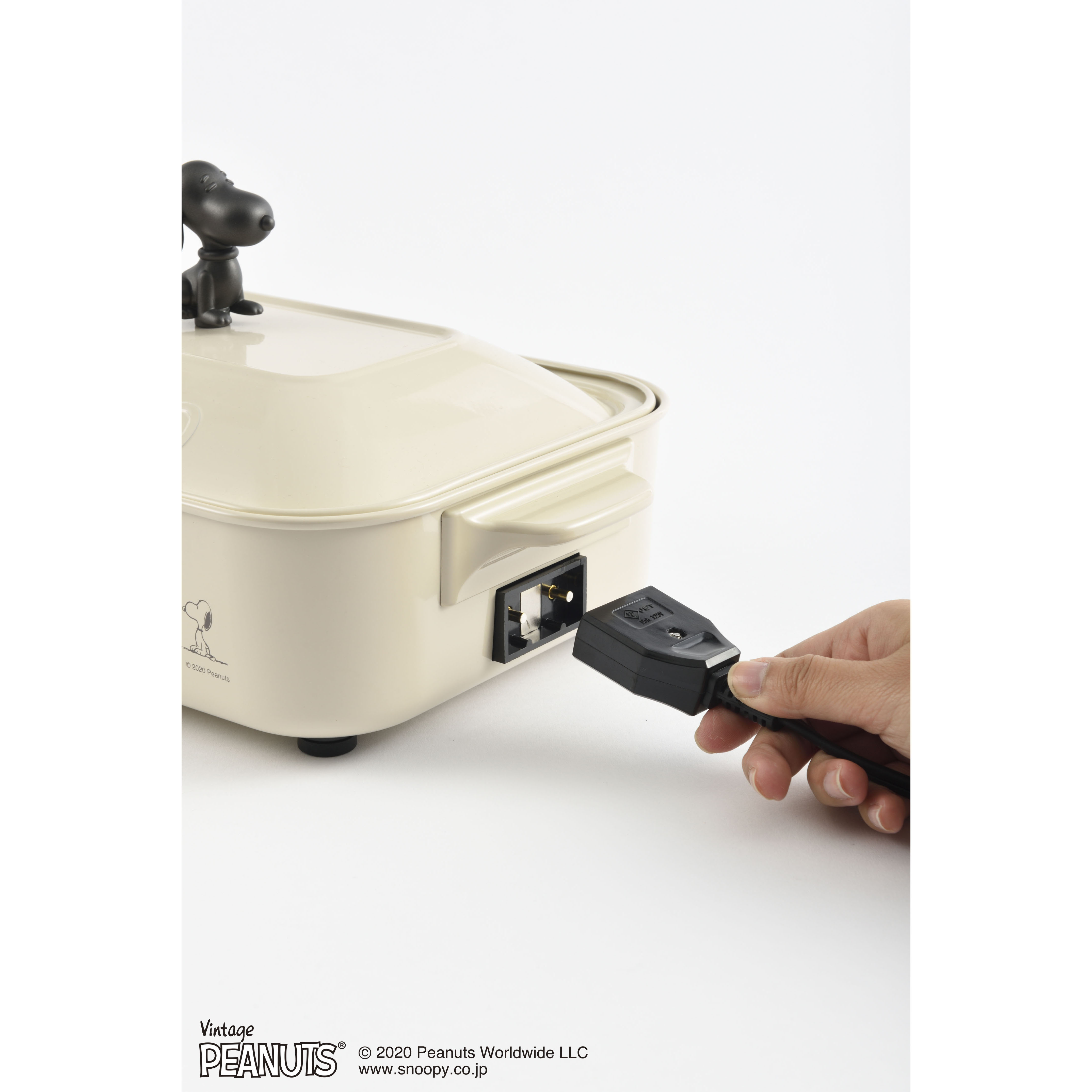 大口注文・法人のお問い合わせはこちら鋳物ホーローをイメージしたデザインで食卓を彩るホットプレートに、PEANUTSシリーズが仲間入り! 本体前面にはスヌーピー&チャーリー・ブラウンのイラスト入りです。平面プレートとたこ焼きプレートに加えて、スヌーピーたちのミニパンケーキ6種が焼けるプレートが付属。さらにノブ(取っ手)はかわいいスヌーピー型デザインです。 2~3人にちょうど良いA4サイズで、毎日のお料理~おうちパーティーまで幅広く食卓で“つくる”を愉しめます。