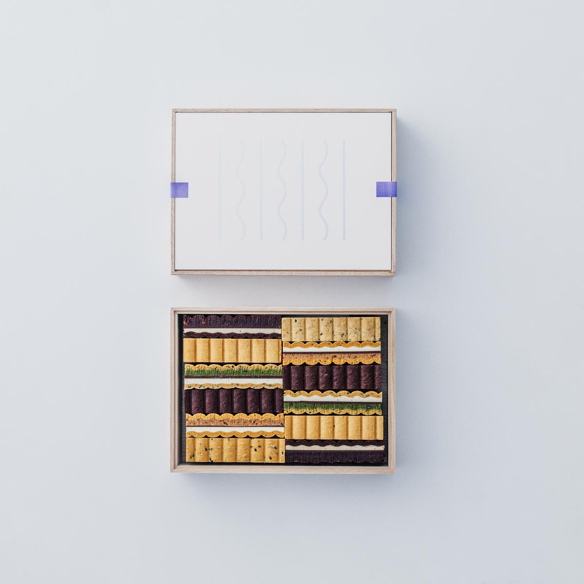 大口注文・法人のお問い合わせはこちら「RAU」の定番焼き菓子「Nami-Nami」は、プレーン、ショコラ、ゴマの波型サブレの間にそれぞれ3種(プラリネ、ショコラ、抹茶)の軽やかなクリームを挟んだサブレです。そして、食感と味のアクセントとしてカカオ豆から作った自家製Bean to Barチョコレートを挟んでいます。BeanとBarをもっと親しみやすくという思いが込められています。