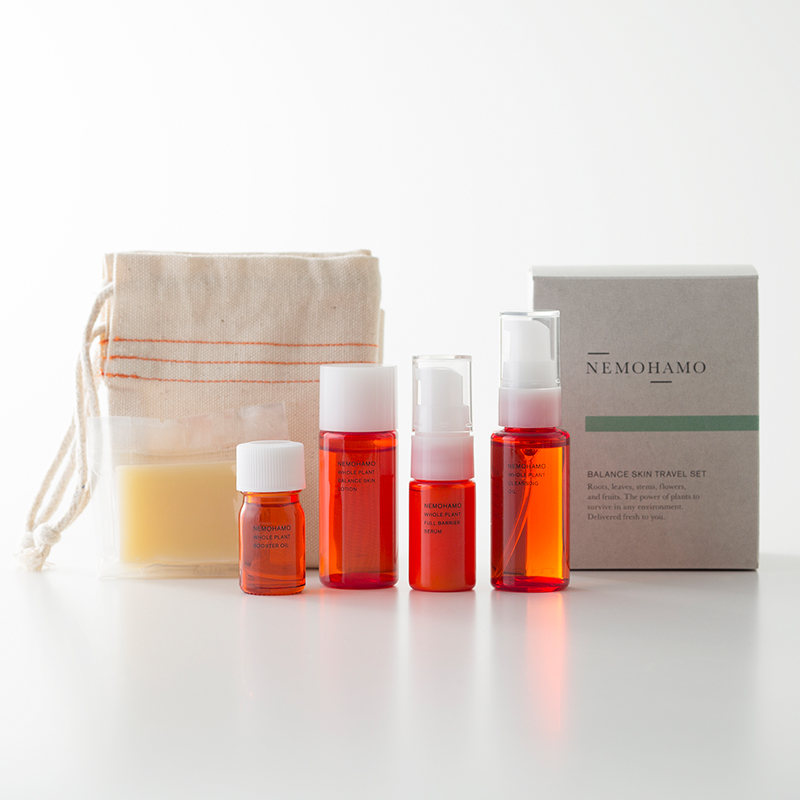 天然成分のみで作る自然派コスメブランド「NEMOHAMO(ネモハモ)」の、スキンケアミニサイズ5点セット(バランススキン)です。肌の調子を整えるバランススキンローションを含むトータルスキンケア5種が入っています。オタネニンジンなど植物エキスの力でなめらかな肌へ導きます。