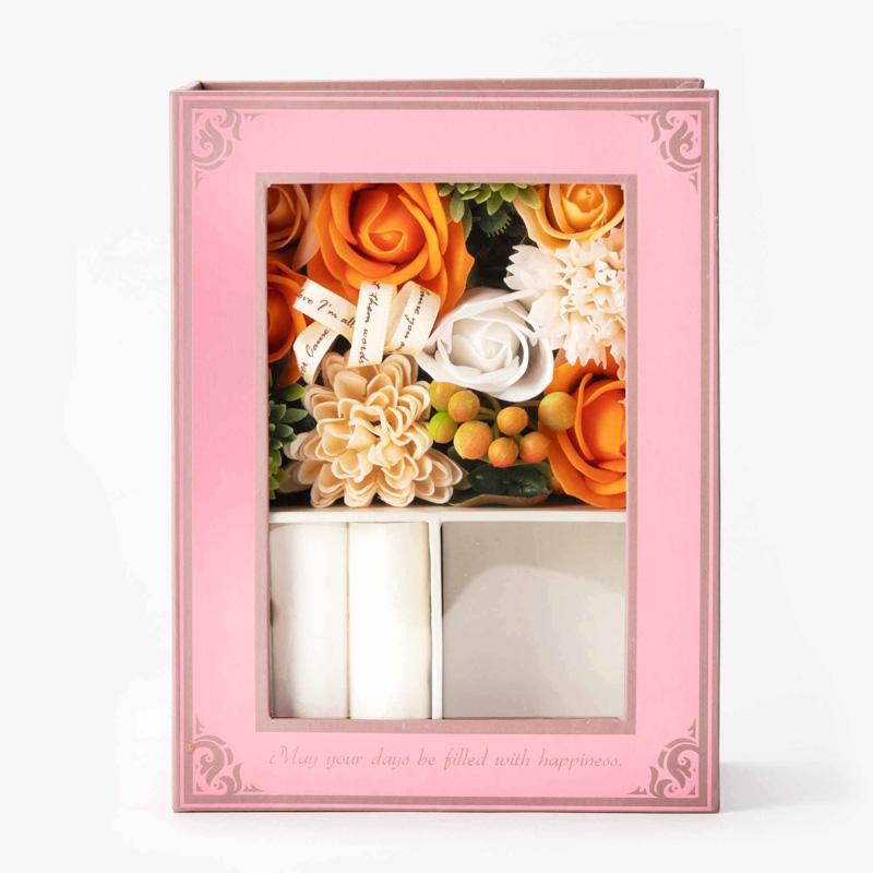 大口注文・法人のお問い合わせはこちらクラシカルなモデルのBOOKスタイルのアクセサリーボックスです。ピンクの縁取りで、中のアレンジはオレンジカラーをベースにお作りしています。カバーを開ける度に、バスフレグランスのほのかな香りが広がります。アクセサリーと一緒にプレゼントしたり、ギフトボックスとしてご利用もおすすめです。