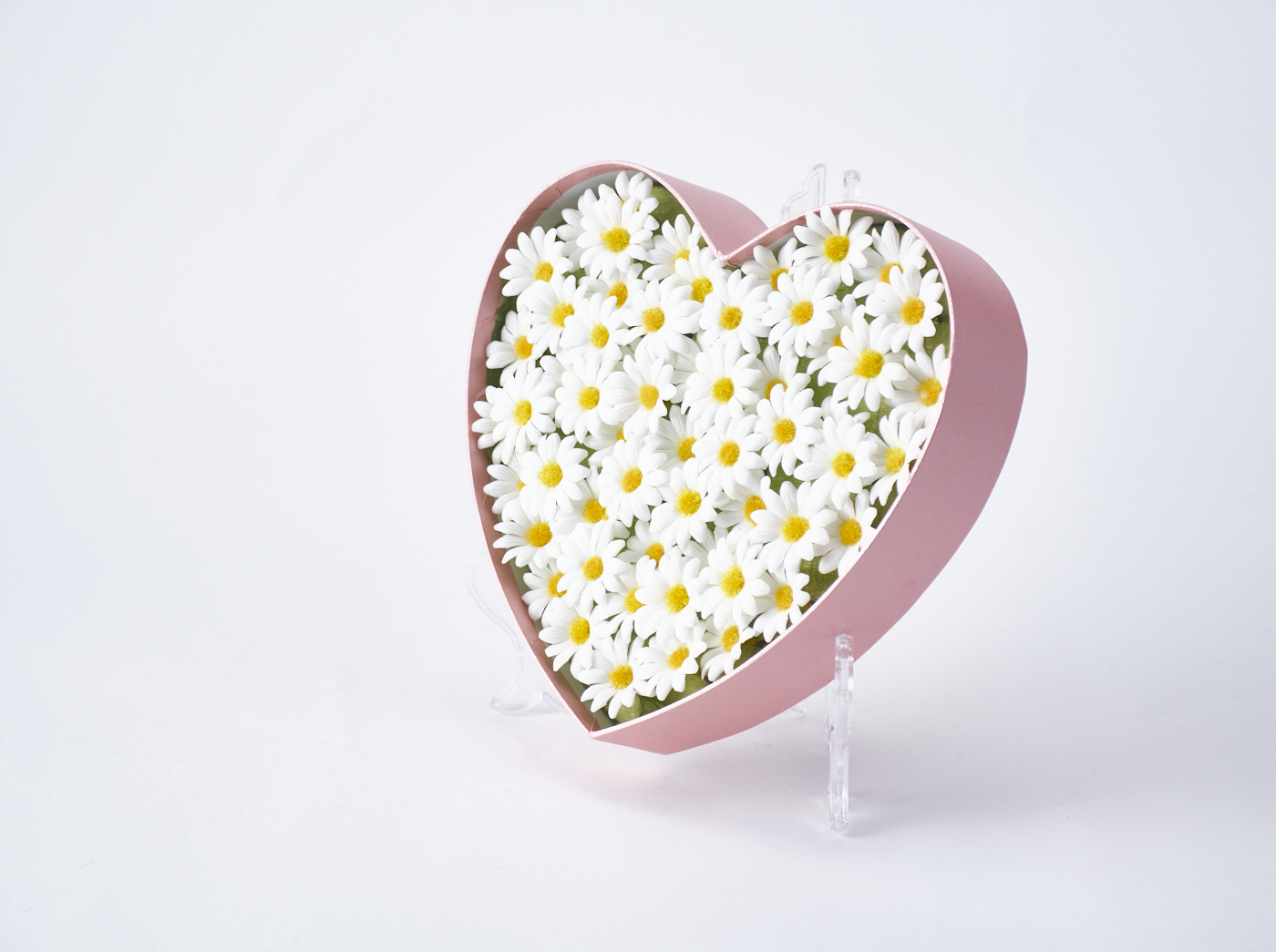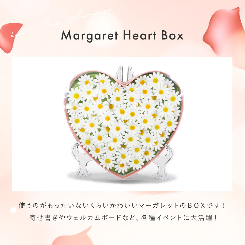 「フラワーギフトとして楽しんだ後に、使って終われる商品がほしい」というお客様の声から生まれた「花のカタチの入浴剤」。本物のお花のように綺麗なマーガレットの入浴剤が、ハートのボックスに入っています。飾って楽しめるスタンド付きで、華やかな見た目はサプライズギフトとしても。