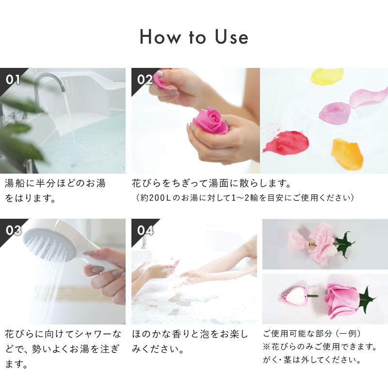 1.湯船に半分程お湯をはります。 2.花びらをちぎって湯面に散らします。(約200Lのお湯に対して、1~2輪を目安にご使用ください。) 3.花びらにシャワーなどで勢いよくお湯を注ぎます。 4.ほのかな香りと泡が楽しめます。 ※花びらのみ、入浴剤としてご使用いただけます。ご使用前にがく・茎などは外していただくようお願いいたします。