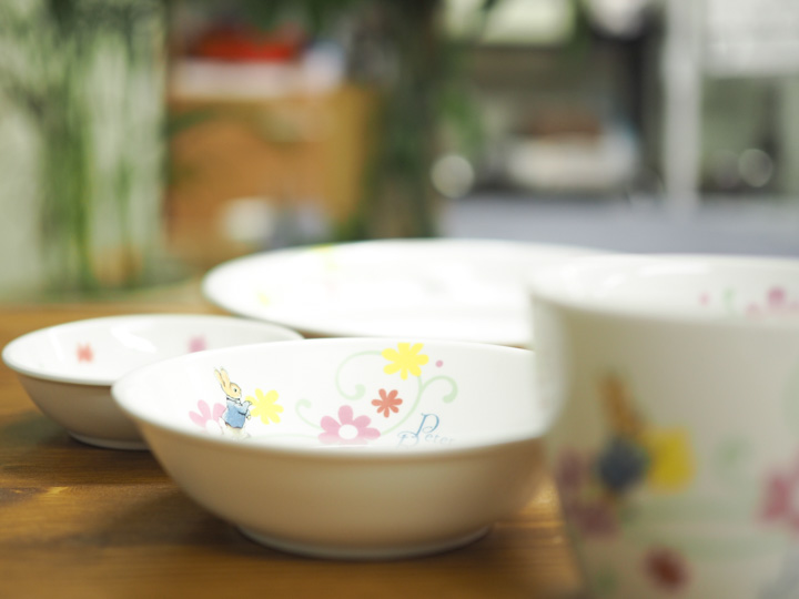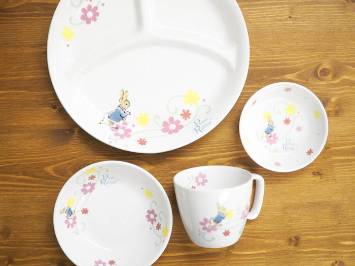 ピーターラビットの絵柄がかわいらしい、ランチプレート・小皿・深小皿・カップ の食器4点セットが登場しました。
