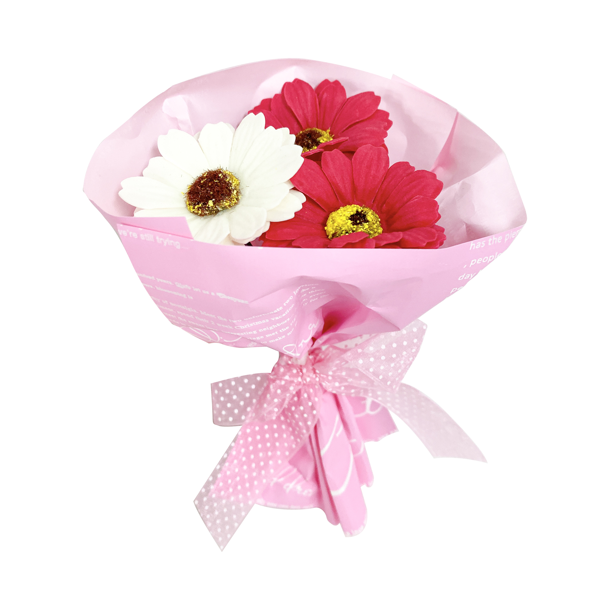 「フラワーギフトとして楽しんだ後に、使って終われる商品がほしい」というお客様の声から生まれたバスフレグランス「花のカタチの入浴剤」です。ガーベラを3本をブーケにしたようなフラワーギフトです。ピンクのラッピングとリボンでとってもキュートなデザインが魅力です。