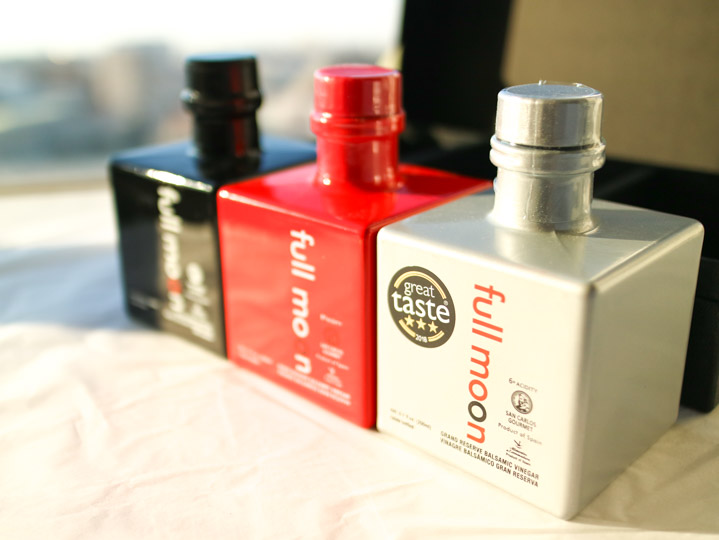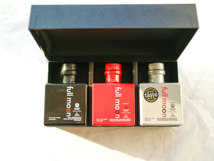 フルムーンのバルサミック・ビネガー グランリザーブ12年熟成、バルサミック・ホワイトビネガー グランリザーブ12年熟成、エキストラヴァージンオリーブオイルの詰め合わせボックスです。
