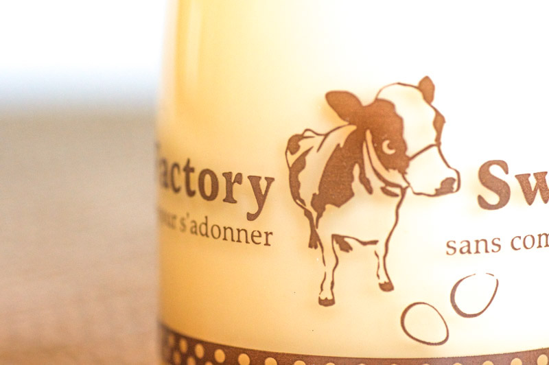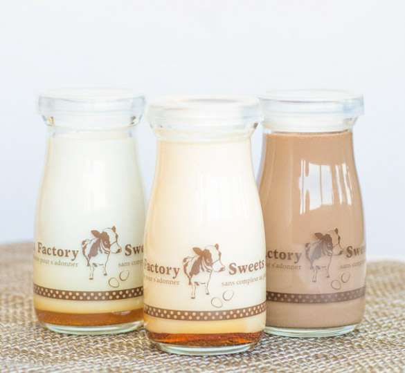 Sweets Factory という文字と、牛の絵が印象的な牛乳瓶はギフトに最適です!【容量は100gです。】