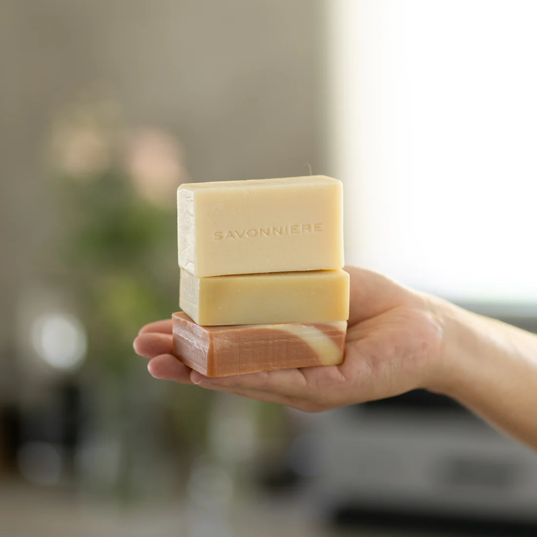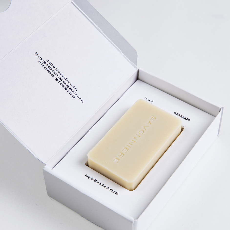ホワイトクレイ(白粘土)の優しい洗浄力で肌をいたわりながら汚れをオフ。 保湿力の高いカリテバターが、健やかな肌のコンディションをサポートします。ローズのような華やかゼラニウムの香りは女性ホルモンのバランスを整えてくれる効果もあります。 「SAVONNIÈRE」の石鹸の中では最もバランスの取れた石鹸で、初めて「SAVONNIÈRE」を使うお客様におすすめです。
