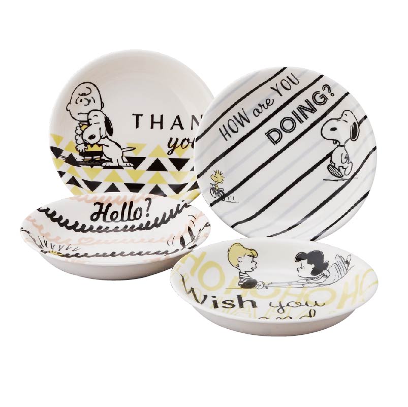 大口注文・法人のお問い合わせはこちら・パスタプレート×4枚 子供も大人も楽しめるスヌーピーのパスタプレートセット。レンジ、食洗機使用OK。4枚とも柄が異なり、楽しく食卓を彩ります。