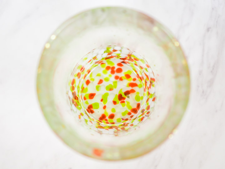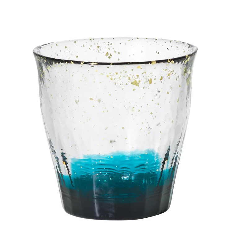 ロックグラスの淡い色は底から飲み口にかけて徐々に薄くなっていき、飲み口では金箔の鮮やかなデザインが入っています。