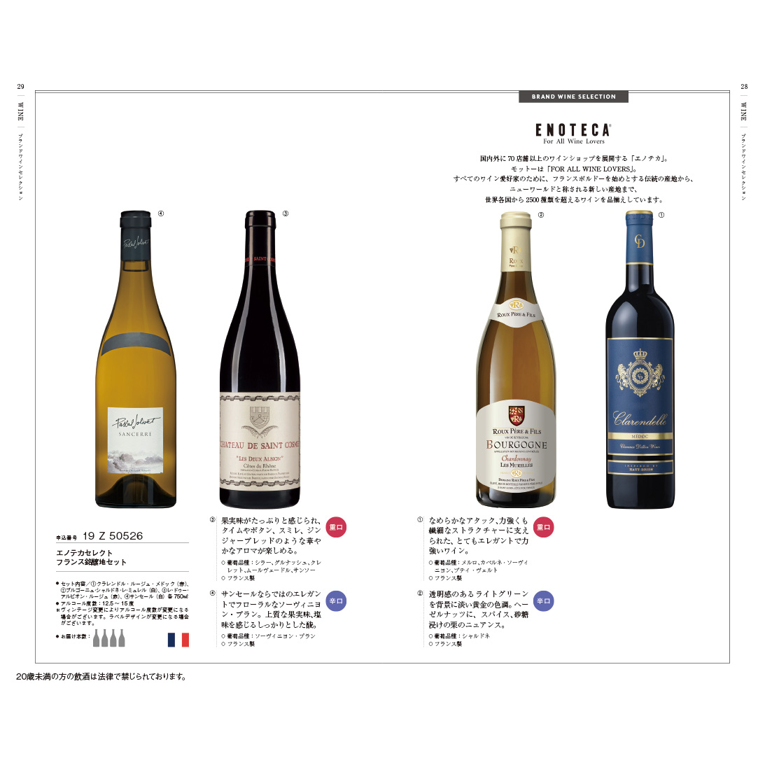 | 注意事項 | ・商品ラインナップはコースにより異なります。 ・掲載商品や誌面等はリニューアルにより変動することがあります。 ・カタログギフトを受け取った方にお好きな酒類をお選びいただけます。20歳未満の方の飲酒は法律で固く禁じられております。酒類お申込の際にお申込の方の年齢を確認させて頂いております。 |