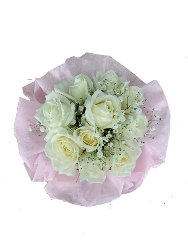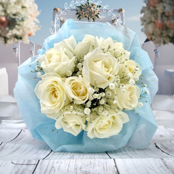厳選した国産のバラを10本使用した純白のホワイトブーケです。可愛さだけではなく大人の雰囲気も兼ね備えた、送る相手を選ばないプレゼントは長くお楽しみ頂けます。ラッピングペーパーで印象を変えることが出来ますので、お客様ならではのプレゼントに変身します。