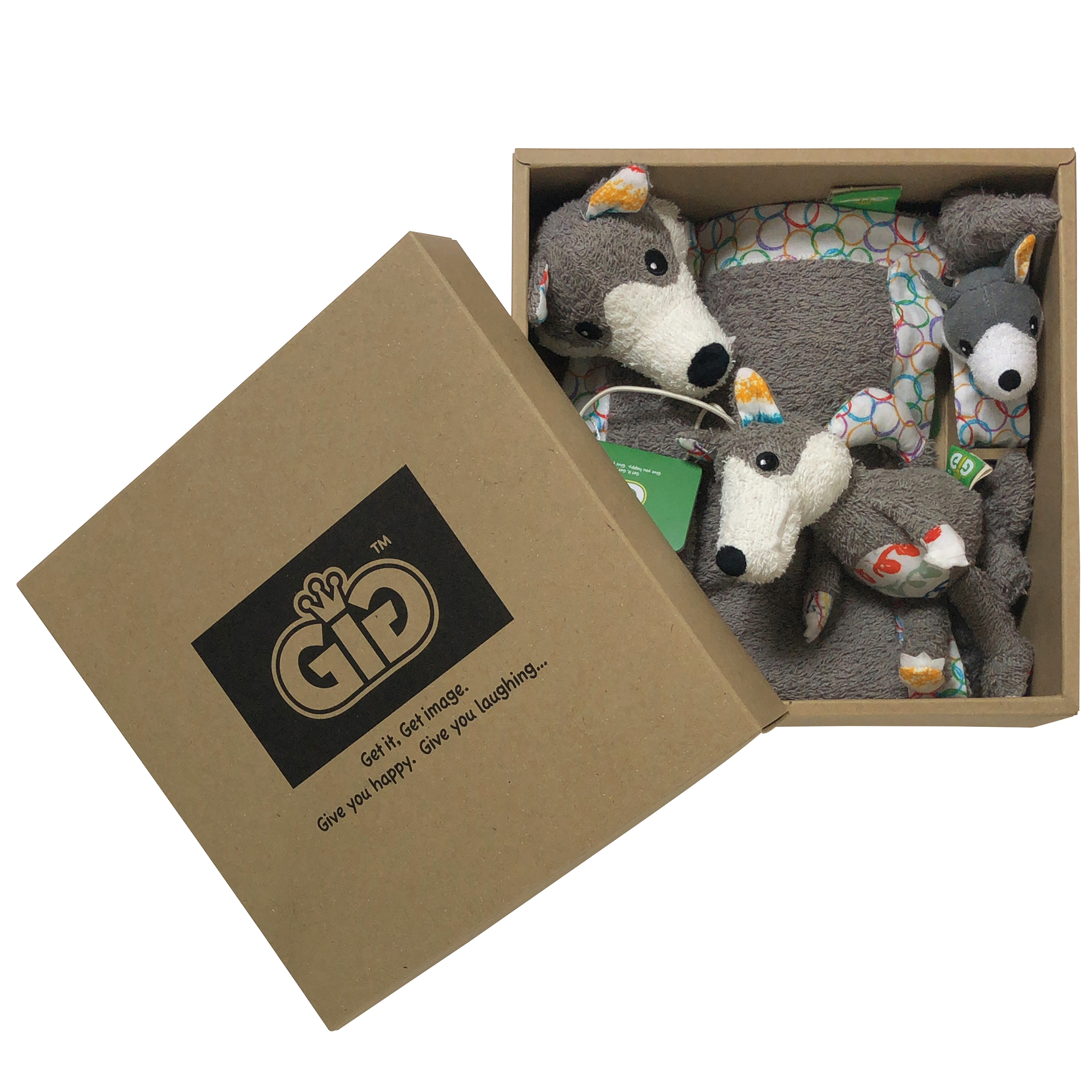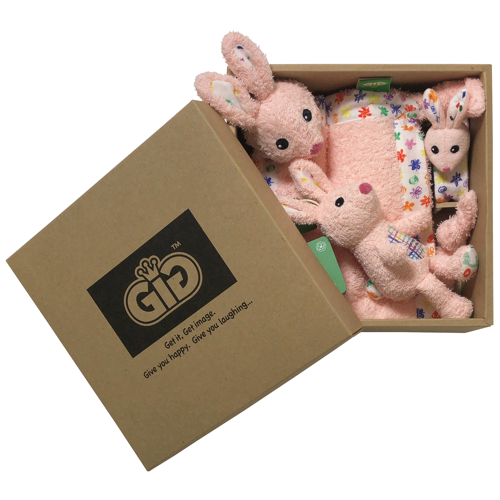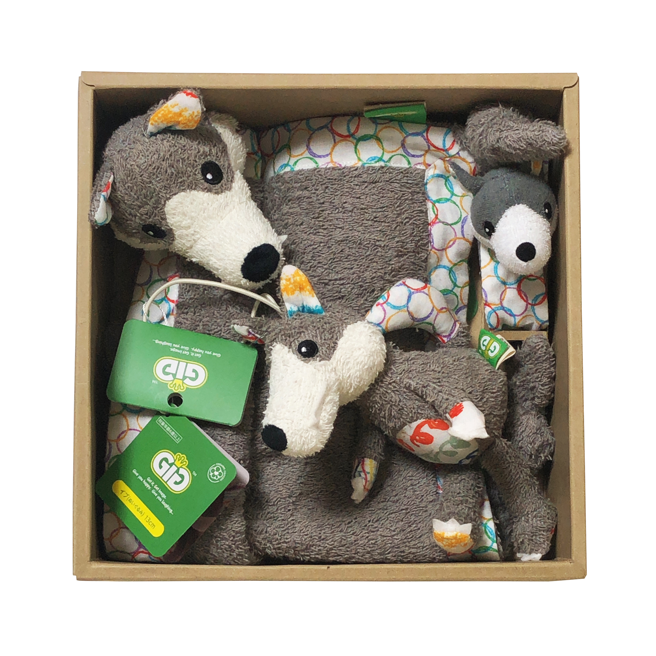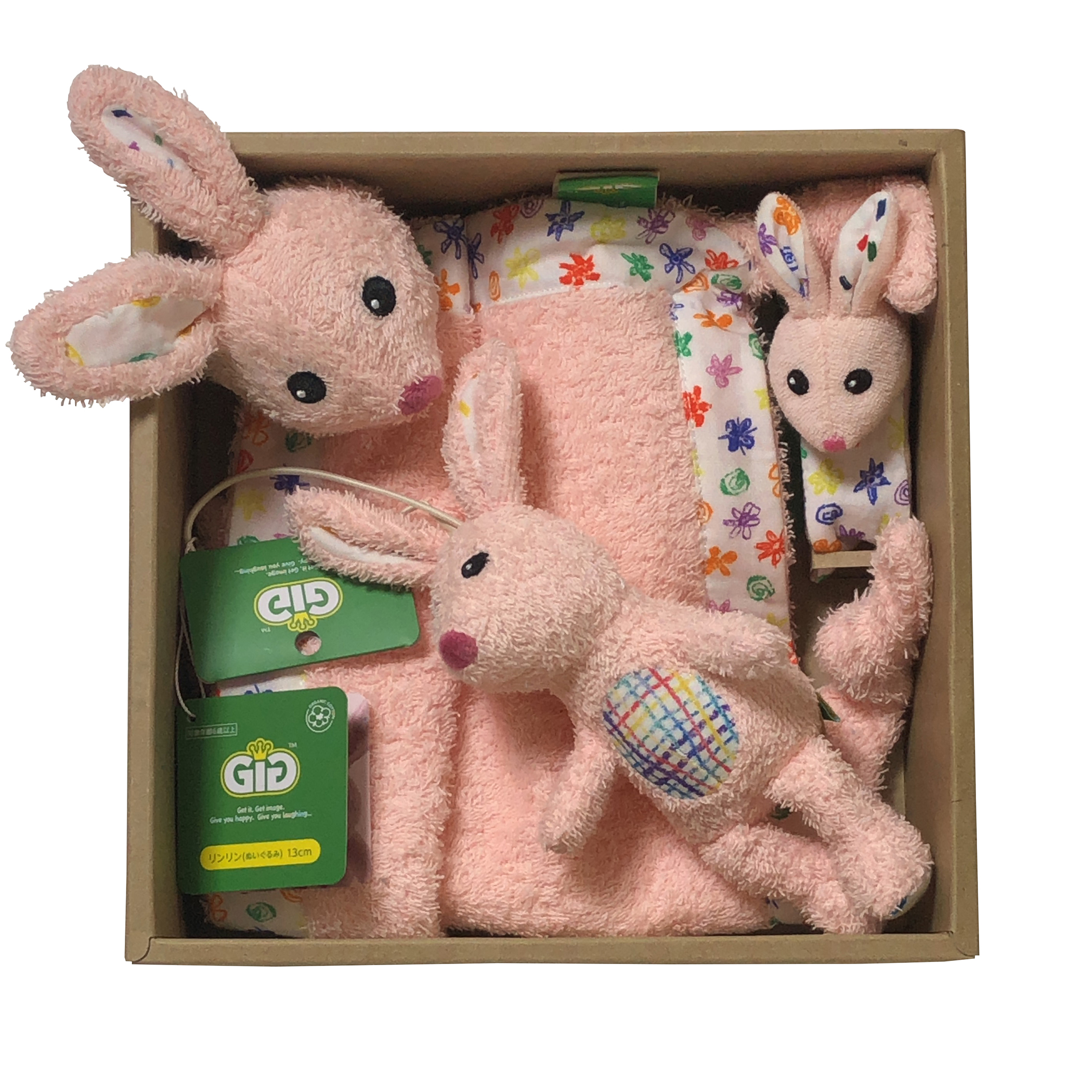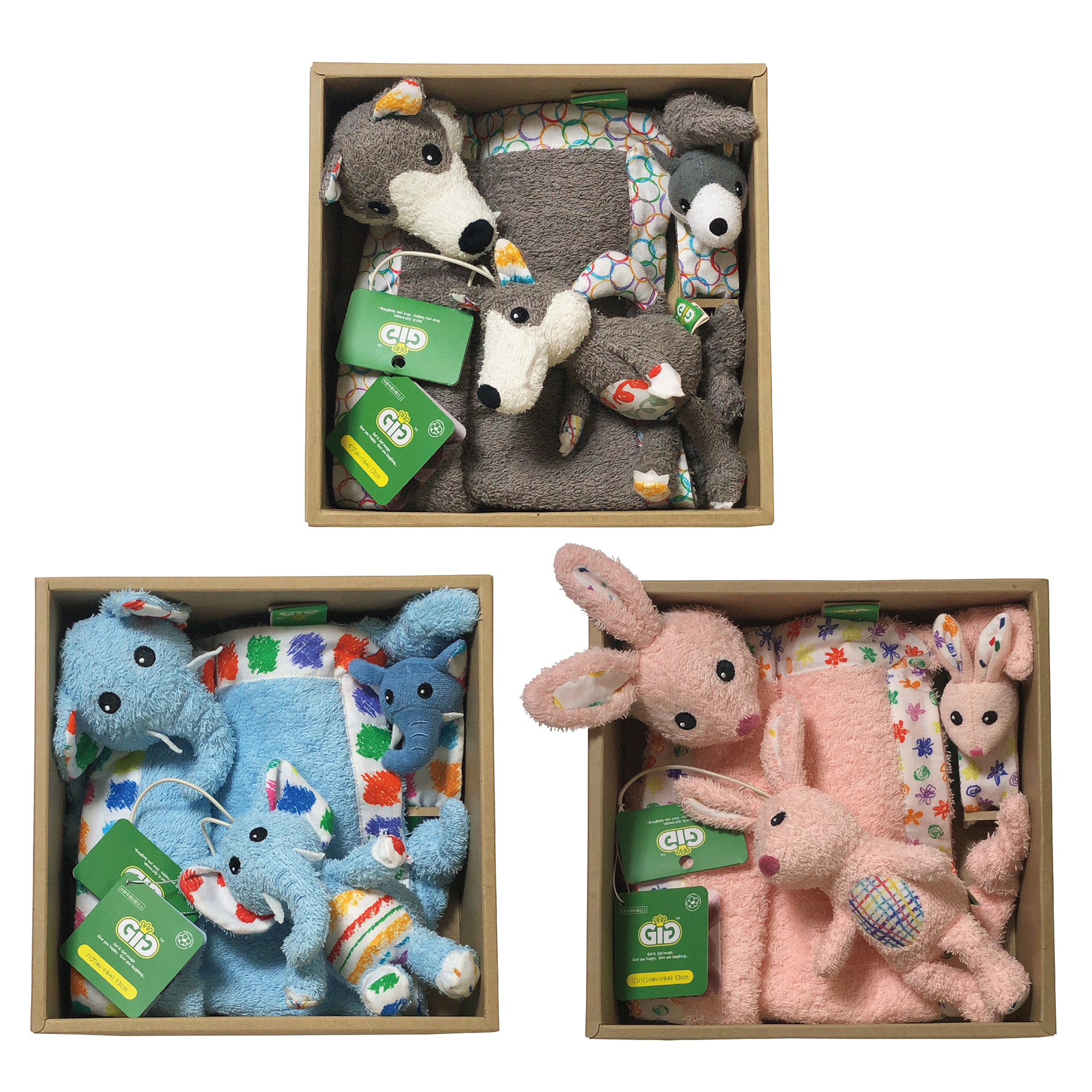 GiGIのベビーグッズが入ったセットになっておりますので、出産祝いにオススメです。ぬいぐるみと同じオーガニックコットンを使用しているのでお肌の弱いお子様でも安心してご使用いただけます。またGiGiのロゴ入りのギフトボックス入りなのでプレゼントにぴったりです。