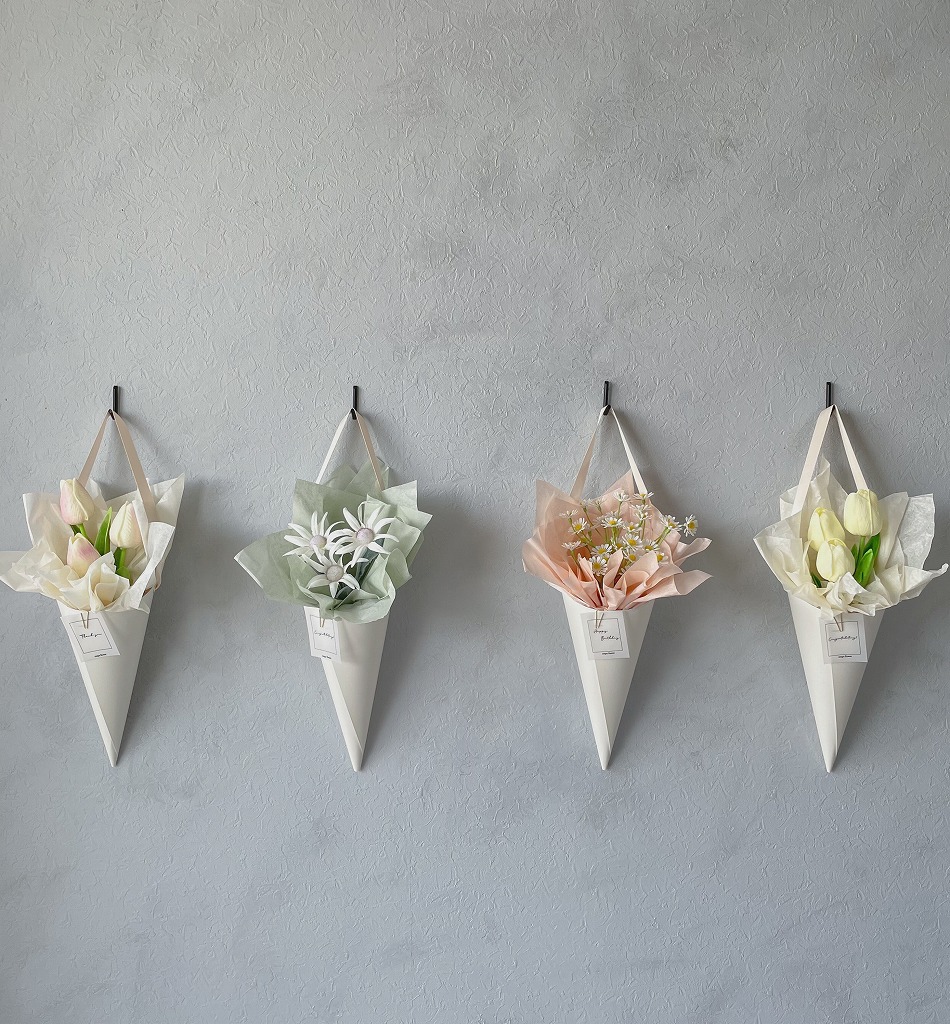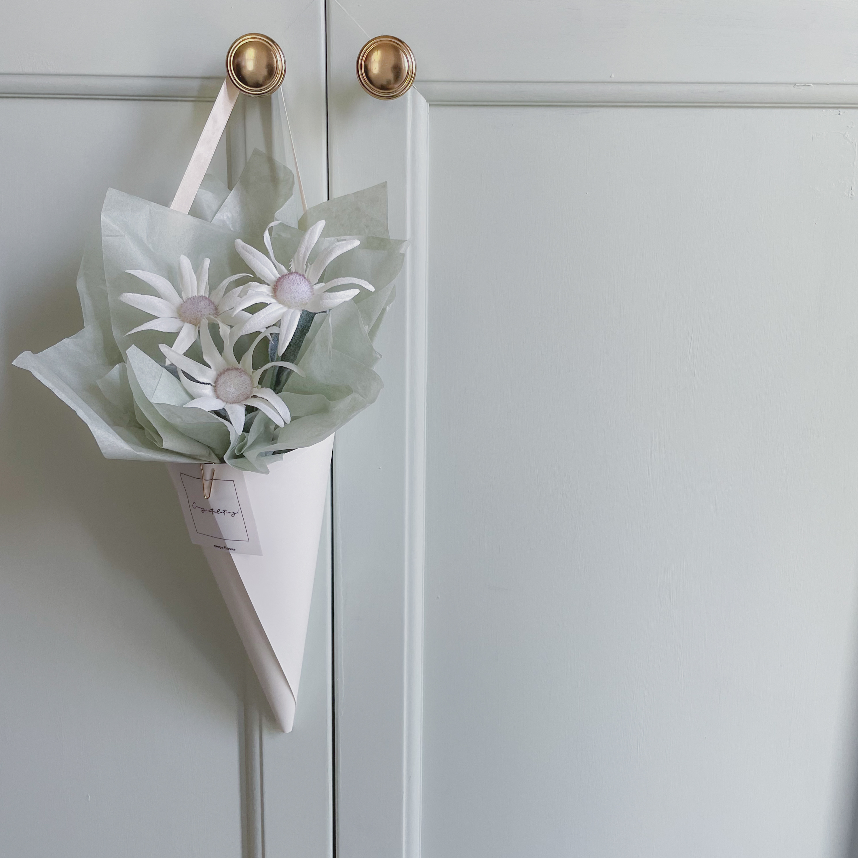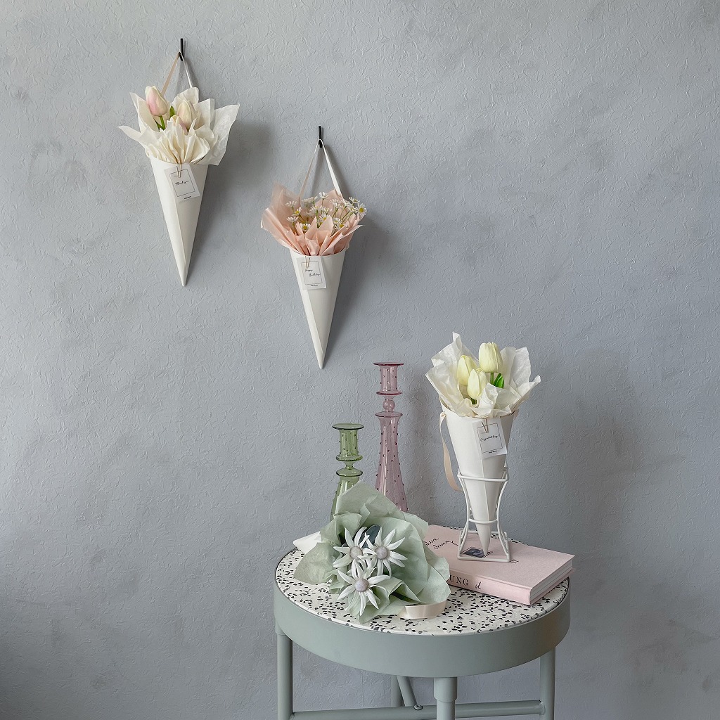 そのまま壁に飾っていただくのがおすすめですが、アイスクリームスタンドに立てても可愛いです。ラッピングから出してお好みのフラワーベースに挿していただくこともできます。