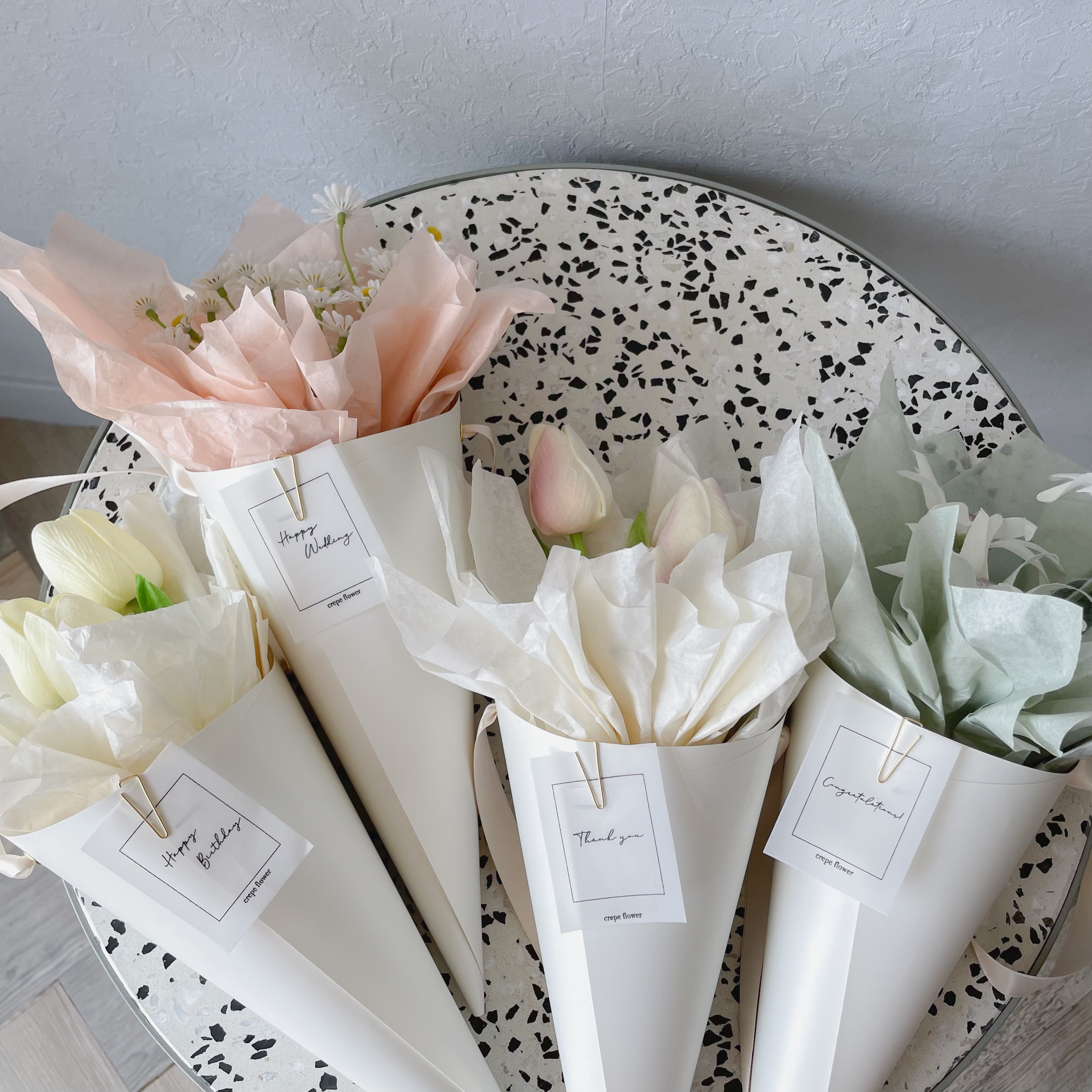 お花は4種類。それぞれに合わせてラッピングのカラーも変えています。クレープに見立てたパッケージは背面にロゴプリントを施したマット加工のオリジナルペーパーを使用。サテンリボンの持ち手をつけて壁やドアノブに掛けていただけるように作りました。