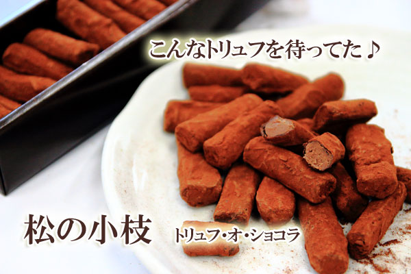 大口注文・法人のお問い合わせはこちらバレンタインの定番のトリュフチョコ、意外と一粒が高くて、気軽にパクパク食べられないですよね。 「トリュフ・オ・ショコラ 」は松の小枝みたいなプチスティックサイズで、一箱に30粒もあるため、気軽につまめるし食べ応えも十分です!