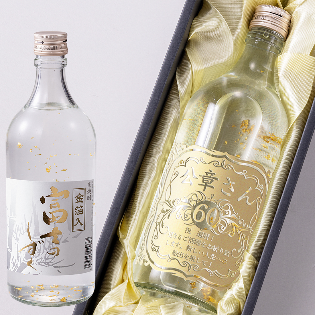 富士山の水を贅沢に使用した米焼酎は、金箔も入っていて特別感があります。ゴールドのオリジナル彫刻のボトルは、飲み終わった後も記念に飾っておきたくなるゴージャスなデザインです。節目を迎える方や、大切な方の記念日を上質な焼酎でお祝いしませんか。