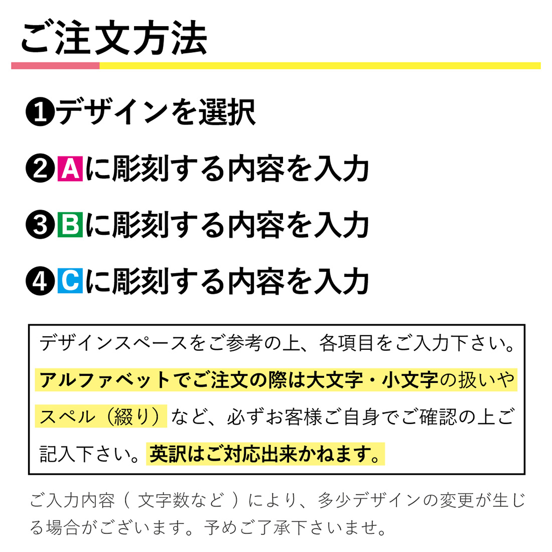 ※ガラス製品は製法上、彫刻とは関係なく微細な傷や気泡などが入っている場合ががございます。 ※ネックラベルや裏ラベルなどに多少の破れ・剥がれなどがある場合がございます。予めご了承くださいませ。 ※ご注文確定後は迅速に製作作業に入ります。お客様のご記入内容に、不備や不明点がある場合も、原則「当店の判断にて」製作に入らせて頂きます。 ※製作作業に入ってからの内容変更やキャンセルなどは承りかねますので、ご記入内容は十分ご確認下さいますようお願いいたします。 ※デザインの事前確認は承りかねますので予めご了承くださいませ。