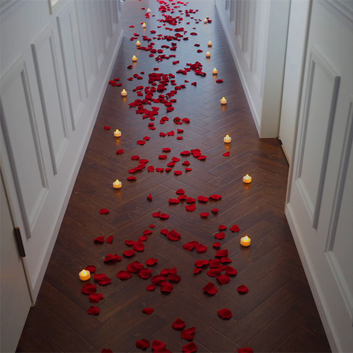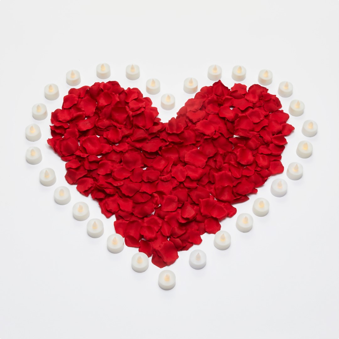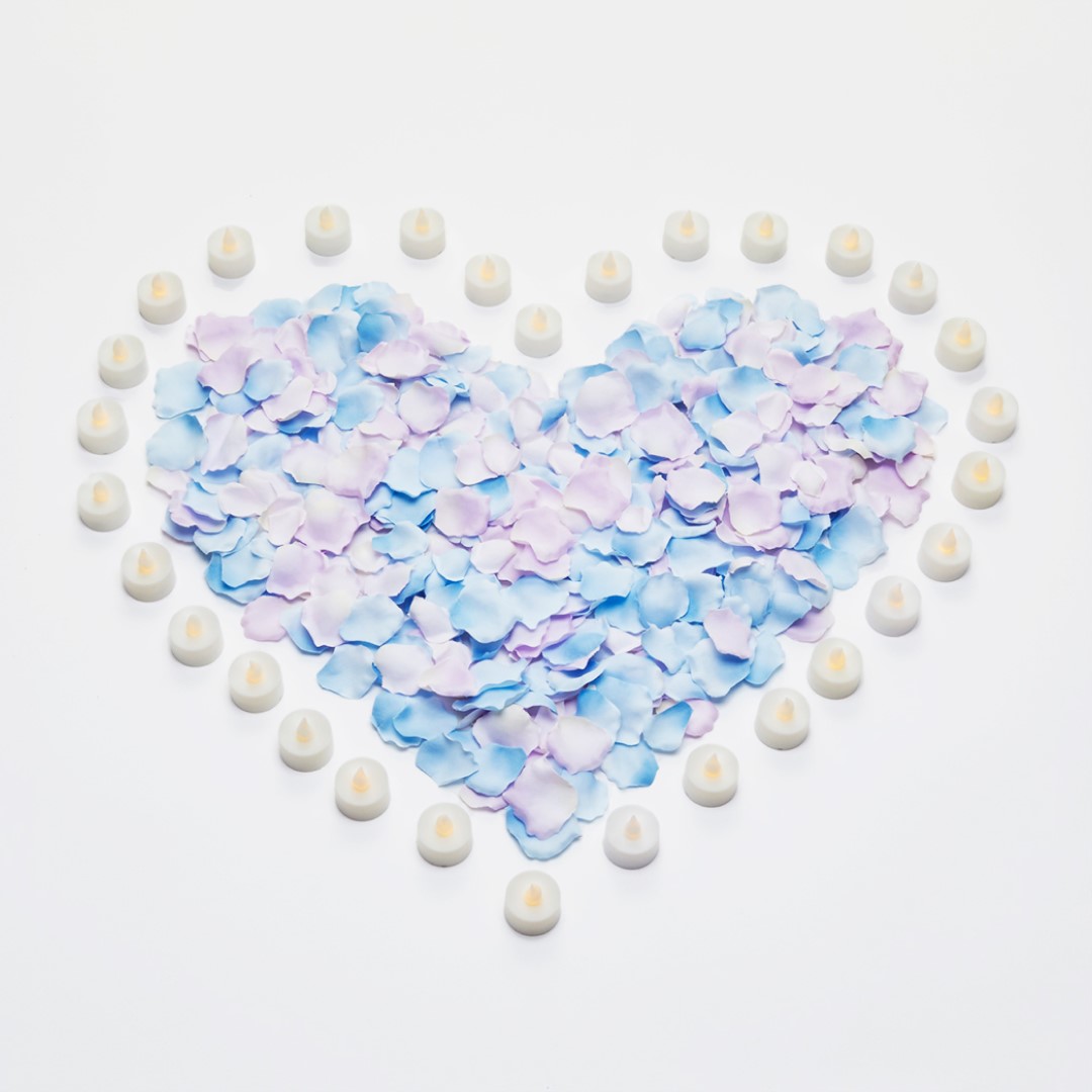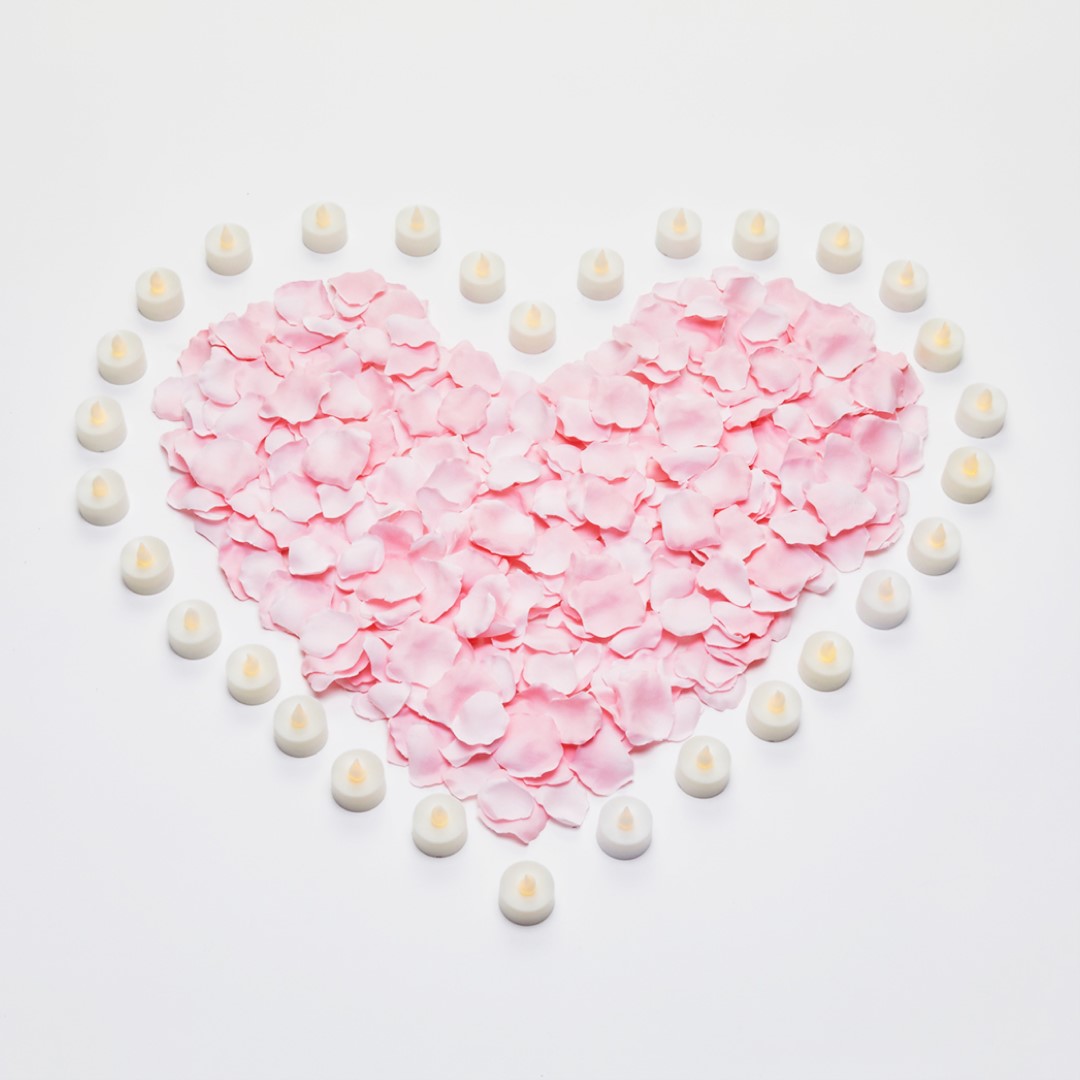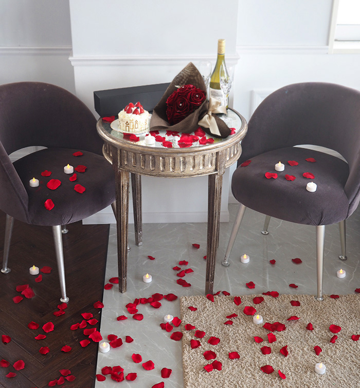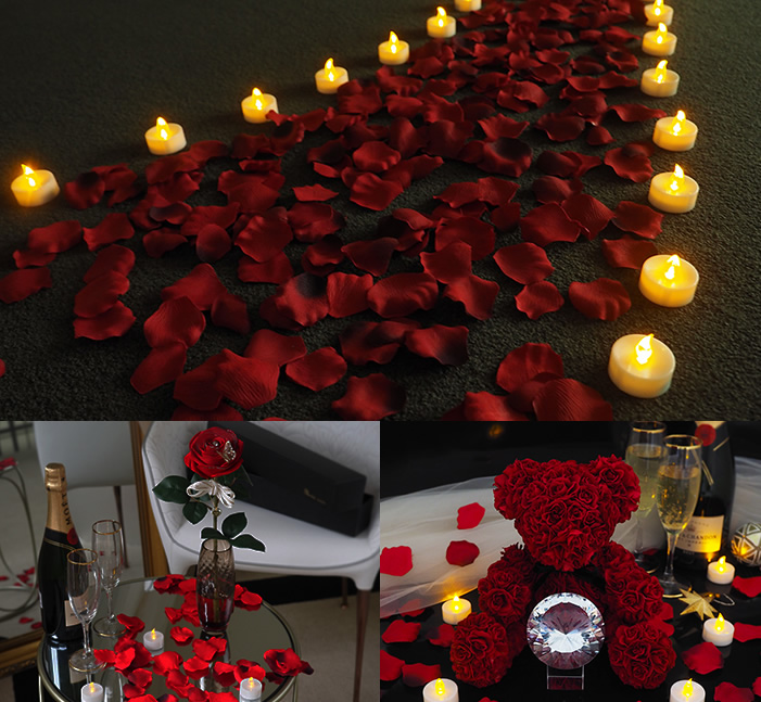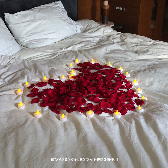 ホテルの部屋の廊下からベッドまで花びらで道をつくったり、「I ♡You」などのメッセージを作ることができます。主役のプレゼントを引き立たせる演出にオススメです。一生に一度のプロポーズや20歳のバースデーなど、特別な節目のイベントにぴったりのボリュームです。 LEDライトは、本物のキャンドルではなく炎の神秘的なゆらめきを再現しているLEDキャンドルなので、安全にご使用いただけます。また、点灯時間は約50時間のため、パートナーが家に来る前に、お風呂に入っている間に、ホテルへ先にチェックインして準備…など、余裕を持って準備することできます。