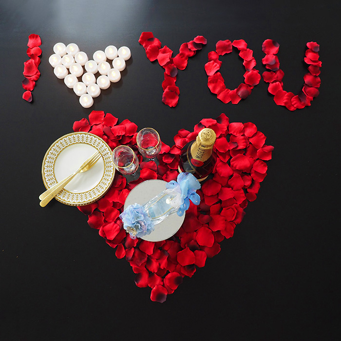 テーブルやベッドの上にメインとなるプレゼントを置き、その周りをハートの形になるように花びらとキャンドルを並べます。Instagramでも人気のアレンジで、幅広い世代の方から好評です。