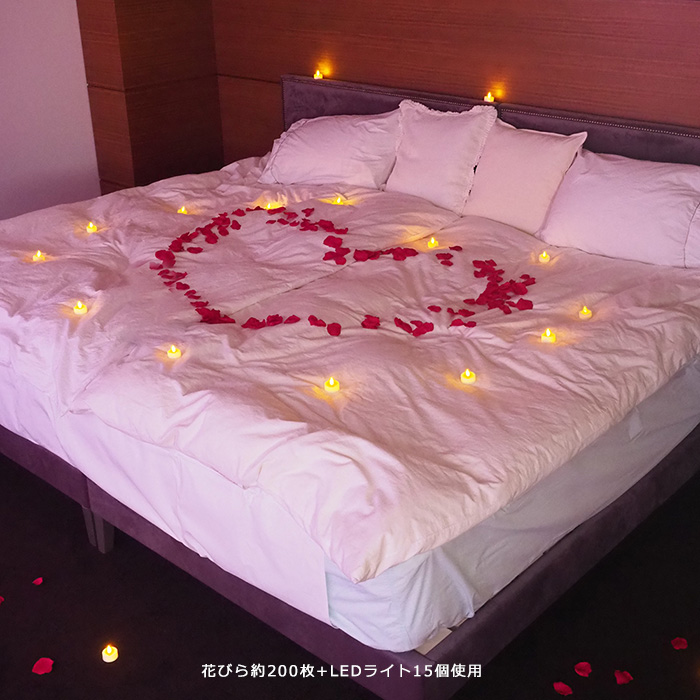 大口注文・法人のお問い合わせはこちらたった5分で簡単に非日常空間を演出できる「バラの花びら(造花)約400枚」と「LEDキャンドルライト30個」がセットになったサプライズ演出アイテムです。 花びらの色はレッドとピンクの2種類からお選びいただけます。LEDライトはスイッチひとつで点灯し不器用な方でも安心、【いつもの部屋】や【初めて行くホテル】がロマンティックな空間に早変わりします。
