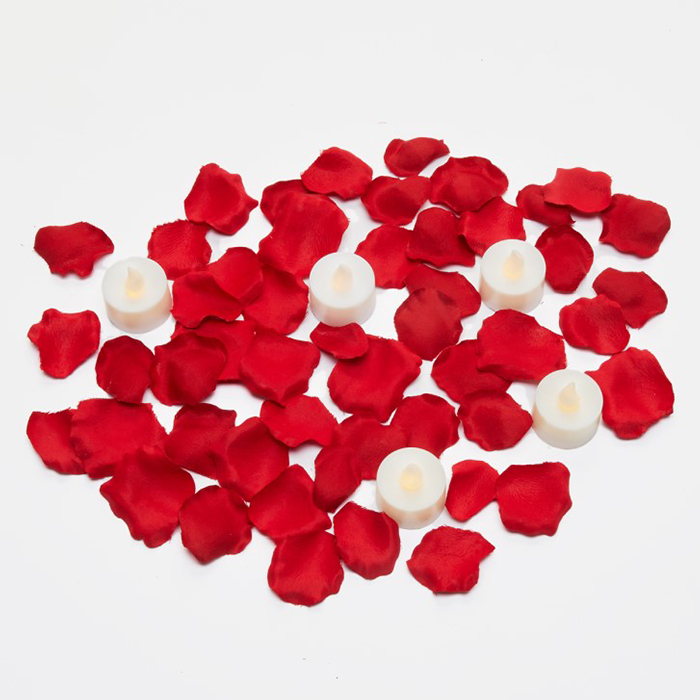 たった5分で簡単に非日常空間を演出できる「バラの花びら約50枚」と「LEDキャンドルライト5個」がセットになったサプライズ演出アイテムです。